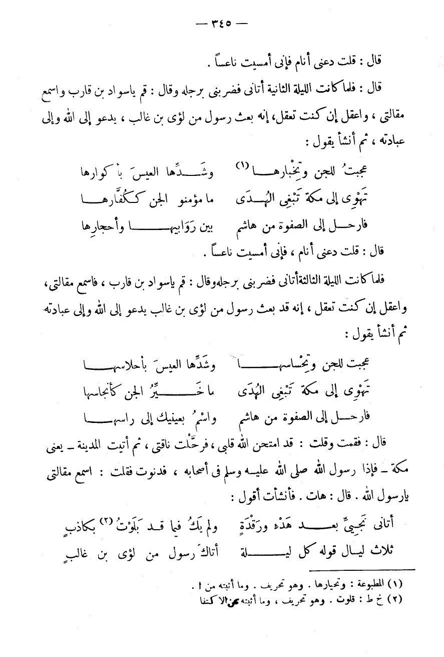 وَاعْقِلْ إِنْ كُنْتَ تَعْقِلُ، إِنَّهُ قَدْ بُعِثَ رَسُولٌ مِنْ لُؤَيِّ بْنِ غَالِبٍ يَدْعُو إِلَى اللَّهِ وَإِلَى عِبَادَتِهِ ثُمَّ أَنْشَأَ يَقُولُ: عَجِبْتُ لِلْجِنِّ وَتَحْسَاسِهَا * وَشَدِّهَا الْعِيسَ بِأَحْلَاسِهَا تَهْوِي إِلَى مَكَّةَ تَبْغِي الْهُدَى * مَا خَيِّرُ الْجِنِّ كَأَنْجَاسِهَا فَارْحَلْ إِلَى الصَّفْوَةِ مِنْ هَاشِمٍ * وَاسْمُ بِعَيْنَيْكَ إِلَى رَأْسِهَا قَالَ: فَقُمْتُ وَقُلْتُ: قَدِ امْتَحَنَ اللَّهُ قَلْبِي، فَرَحَّلْتُ نَاقَتِي، ثُمَّ أَتَيْتُ الْمَدِينَةَ - يَعْنِي مَكَّةَ - فَإِذَا رَسُولُ اللَّهِ صَلَّى اللَّهُ عَلَيْهِ وَسَلَّمَ فِي أَصْحَابِهِ، فَدَنَوْتُ فَقُلْتُ: اسْمَعْ مَقَالَتِي يَا رَسُولَ اللَّهِ.