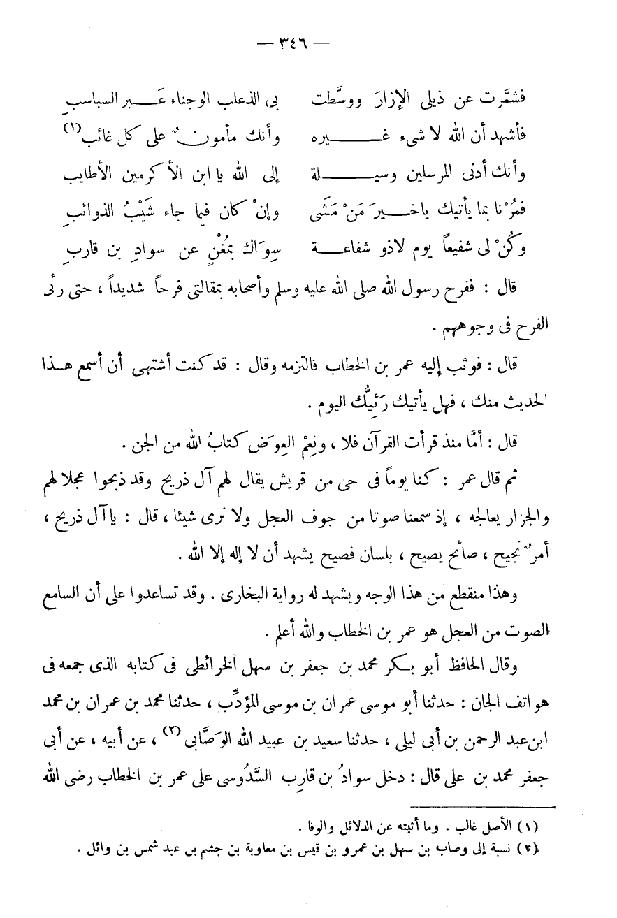 وَقَالَ الْحَافِظُ أَبُو بَكْرٍ مُحَمَّدُ بْنُ جَعْفَرِ بْنِ سَهْلٍ الْخَرَائِطِيُّ فِي كِتَابِهِ الَّذِي جَمَعَهُ فِي هَوَاتِفِ الْجَانِّ: حَدَّثَنَا أَبُو مُوسَى عِمْرَانُ بْنُ مُوسَى الْمُؤَدِّبُ، حَدثنَا مُحَمَّد بن عمرَان بن مُحَمَّد ابْن عَبْدِ الرَّحْمَنِ بْنِ أَبِي لَيْلَى، حَدَّثَنَا سَعِيدُ بن عبيد الله الوصابى (2) ، عَنْ أَبِيهِ، عَنْ أَبِي جَعْفَرٍ مُحَمَّدِ بْنِ عَلِيٍّ قَالَ: دَخَلَ سَوَادُ بْنُ قَارِبٍ السَّدُوسِيُّ على عمر بن الْخطاب رضى الله