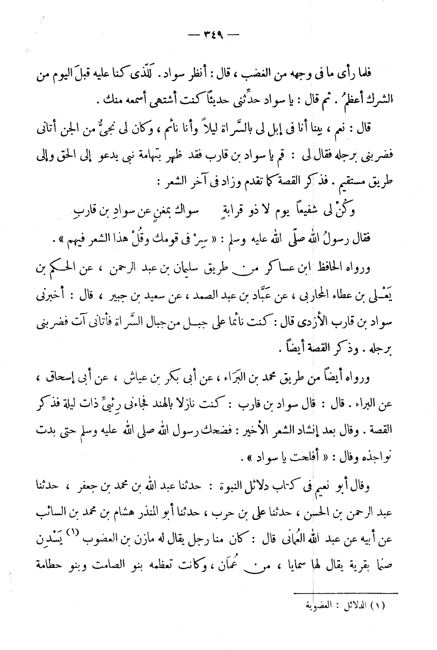 وَقَالَ أَبُو نُعَيْمٍ فِي كِتَابِ دَلَائِلِ النُّبُوَّةِ: حَدَّثَنَا عَبْدُ اللَّهِ بْنُ مُحَمَّدِ بْنِ جَعْفَرٍ، حَدَّثَنَا عَبْدُ الرَّحْمَنِ بْنُ الْحَسَنِ، حَدَّثَنَا عَلِيُّ بْنُ حَرْبٍ، حَدَّثَنَا أَبُو الْمُنْذِرِ هِشَامُ بْنُ مُحَمَّدِ بْنِ السَّائِبِ عَنْ أَبِيهِ عَنْ عَبْدِ اللَّهِ الْعُمَانِيِّ قَالَ: كَانَ مِنَّا رَجُلٌ يُقَالَ لَهُ مَازِن بن العضوب (1) يَسْدُنُ صَنَمًا بِقَرْيَةٍ يُقَالَ لَهَا سَمَايَا، مِنْ عُمَانَ، وَكَانَتْ تُعَظِّمُهُ بَنُو الصَّامِتِ وَبَنُو حُطَامَةَ