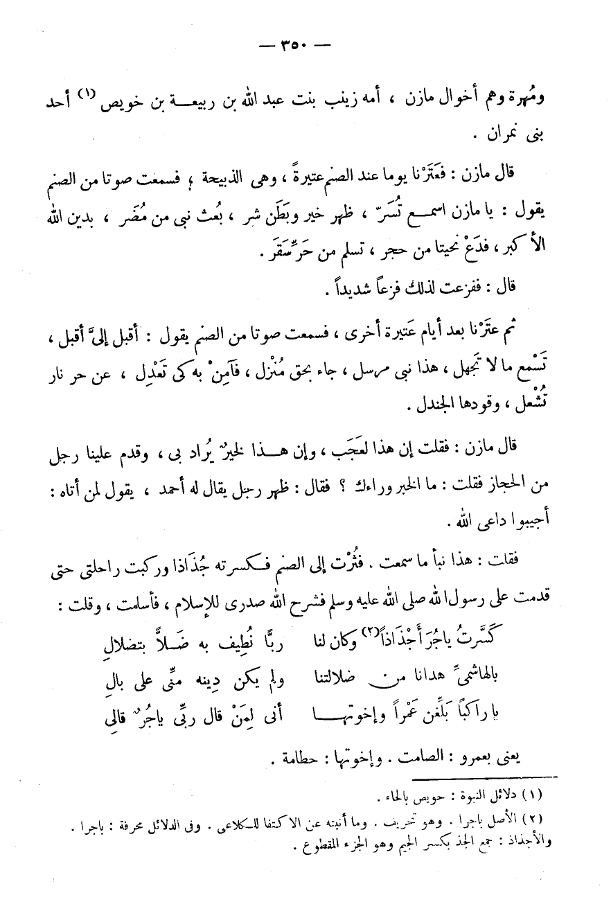 قَالَ مَازِنٌ: فَعَتَرْنَا يَوْمًا عِنْدَ الصَّنَمِ عَتِيرَةً، وَهِيَ الذَّبِيحَةُ، فَسَمِعْتُ صَوْتًا مِنَ الصَّنَمِ يَقُولُ: يَا مَازِنُ اسْمَعْ تُسَرَّ، ظَهَرَ خَيْرٌ وَبَطَنَ شَرٌّ، بُعِثَ نَبِيٌّ مِنْ مُضَرْ، بِدِينِ اللَّهِ الْأَكْبَرْ، فَدَعْ نَحِيَتًا مَنْ حَجَرْ، تَسْلَمْ مِنْ حَرِّ سَقَرْ.