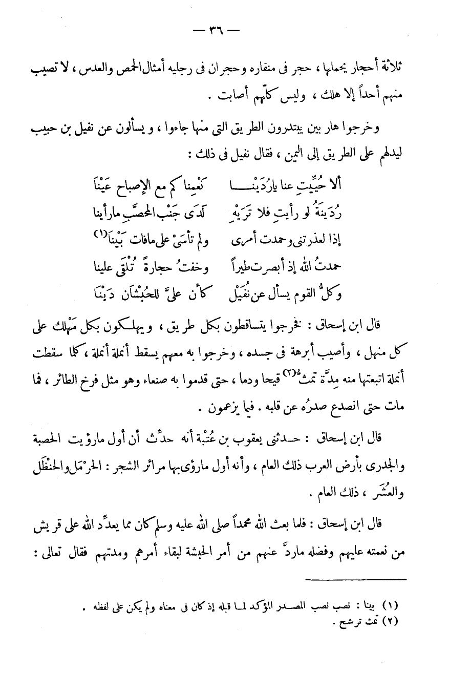 وَخَرَجُوا هَارِبِينَ يَبْتَدِرُونَ الطَّرِيقَ الَّتِي مِنْهَا جَاءُوا، وَيَسْأَلُونَ عَنْ نُفَيْلِ بْنِ حَبِيبٍ لِيَدُلَّهُمْ عَلَى الطَّرِيقِ إِلَى الْيَمَنِ، فَقَالَ نُفَيْلٌ فِي ذَلِكَ: أَلَّا حُيِّيتِ عَنَّا يَا رُدَيْنَا * نَعِمْنَاكُمْ مَعَ الْإِصْبَاحِ عَيْنَا رُدَيْنَةُ لَوْ رَأَيْتِ فَلَا تَرَيْهِ * لَدَى جَنْبِ الْمُحَصَّبِ مَا رَأَيْنَا إِذًا لَعَذَرْتِنِي وَحَمِدْتِ أَمْرِي * وَلَمْ تَأْسَيْ عَلَى مَا فَاتَ بَيْنَا (1) حَمِدْتُ اللَّهَ إِذْ أَبْصَرْتُ طَيْرًا * وَخِفْتُ حِجَارَةً تُلْقَى عَلَيْنَا وَكُلُّ الْقَوْمِ يَسْأَلُ عَنْ نُفَيْلٍ * كَأَنَّ عَلَيَّ لِلْحُبْشَانِ دَيْنَا قَالَ ابْنُ إِسْحَاقَ: فَخَرَجُوا يَتَسَاقَطُونَ بِكُلِّ طَرِيقٍ، وَيَهْلِكُونَ بِكُلِّ مَهْلِكٍ عَلَى كُلِّ مَنْهَلٍ، وَأُصِيبَ أَبْرَهَةُ فِي جَسَدِهِ، وَخَرَجُوا بِهِ مَعَهُمْ يَسْقُطُ أُنْمُلَةً أُنْمُلَةً، كُلَّمَا سَقَطَتْ أُنْمُلَةٌ أَتْبَعَتْهَا مِنْهُ مِدَّةٌ تَمِثُّ (2) قَيْحًا وَدَمًا، حَتَّى قَدِمُوا بِهِ صَنْعَاءَ وَهُوَ مِثْلُ فَرْخِ الطَّائِرِ، فَمَا مَاتَ حَتَّى انْصَدَعَ صَدْرُهُ عَنْ قَلْبِهِ.