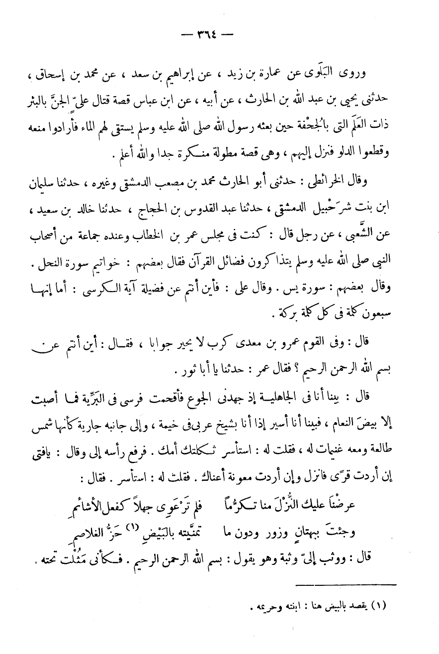 قَالَ: وفى الْقَوْم عَمْرو بن معدى كرب لَا يُحِيرُ جَوَابًا، فَقَالَ: أَيْنَ أَنْتُمْ عَنْ بِسْمِ اللَّهِ الرَّحْمَنِ الرَّحِيمِ؟ فَقَالَ عُمَرُ: حَدِّثْنَا يَا أَبَا ثَوْرٍ.