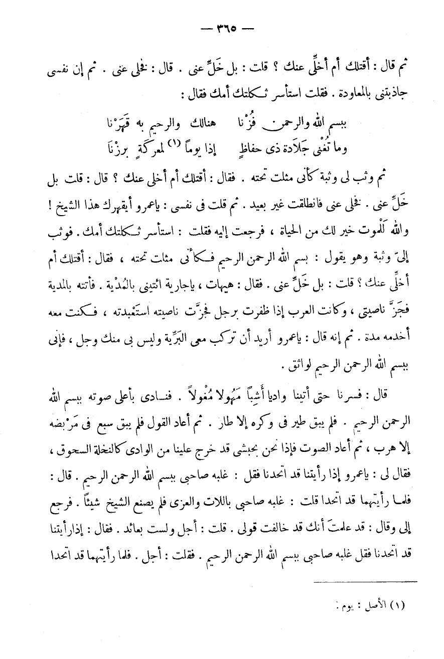 فَقُلْتُ اسْتَأْسِرْ ثَكِلَتْكَ أُمُّكَ فَقَالَ: بِبِسْمِ اللَّهِ وَالرَّحْمَنِ فُزْنَا * هُنَالِكَ وَالرَّحِيمِ بِهِ قَهَرْنَا وَمَا تُغْنِي جَلَادَةُ ذِي حِفَاظٍ * إِذَا يَوْمًا (1) لِمَعْرَكَةٍ بَرَزْنَا ثُمَّ وَثَبَ لِي وَثْبَةً كَأَنِّي مَثَلْتُ تَحْتَهُ.