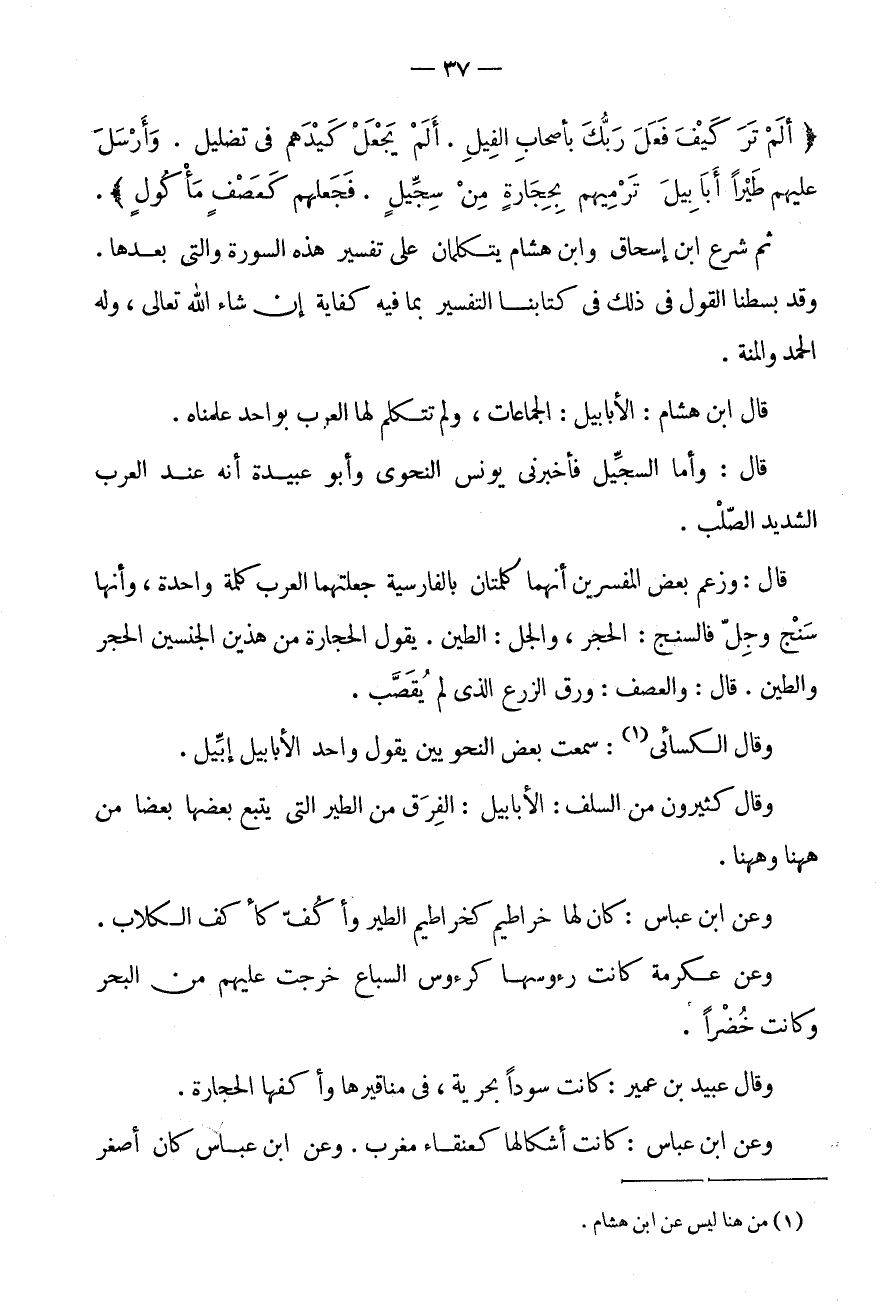 قَالَ ابْنُ هِشَامٍ: الْأَبَابِيلُ: الْجَمَاعَاتُ، وَلَمْ تَتَكَلَّمْ لَهَا الْعَرَبُ بِوَاحِدٍ عَلِمْنَاهُ.