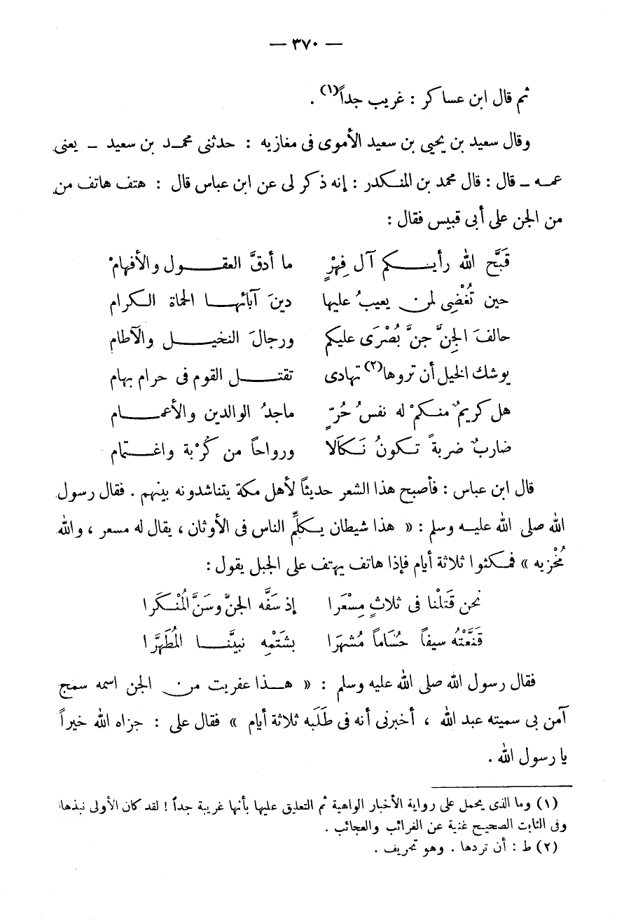 (1) وَمَا الذى يحمل على رِوَايَة الاخبار الْوَاهِيَة ثمَّ التَّعْلِيق عَلَيْهَا بِأَنَّهَا غَرِيبَة جدا! لقد كَانَ الاولى نبذها وفى الثَّابِت الصَّحِيح غنية عَن الغرائب والعجائب.