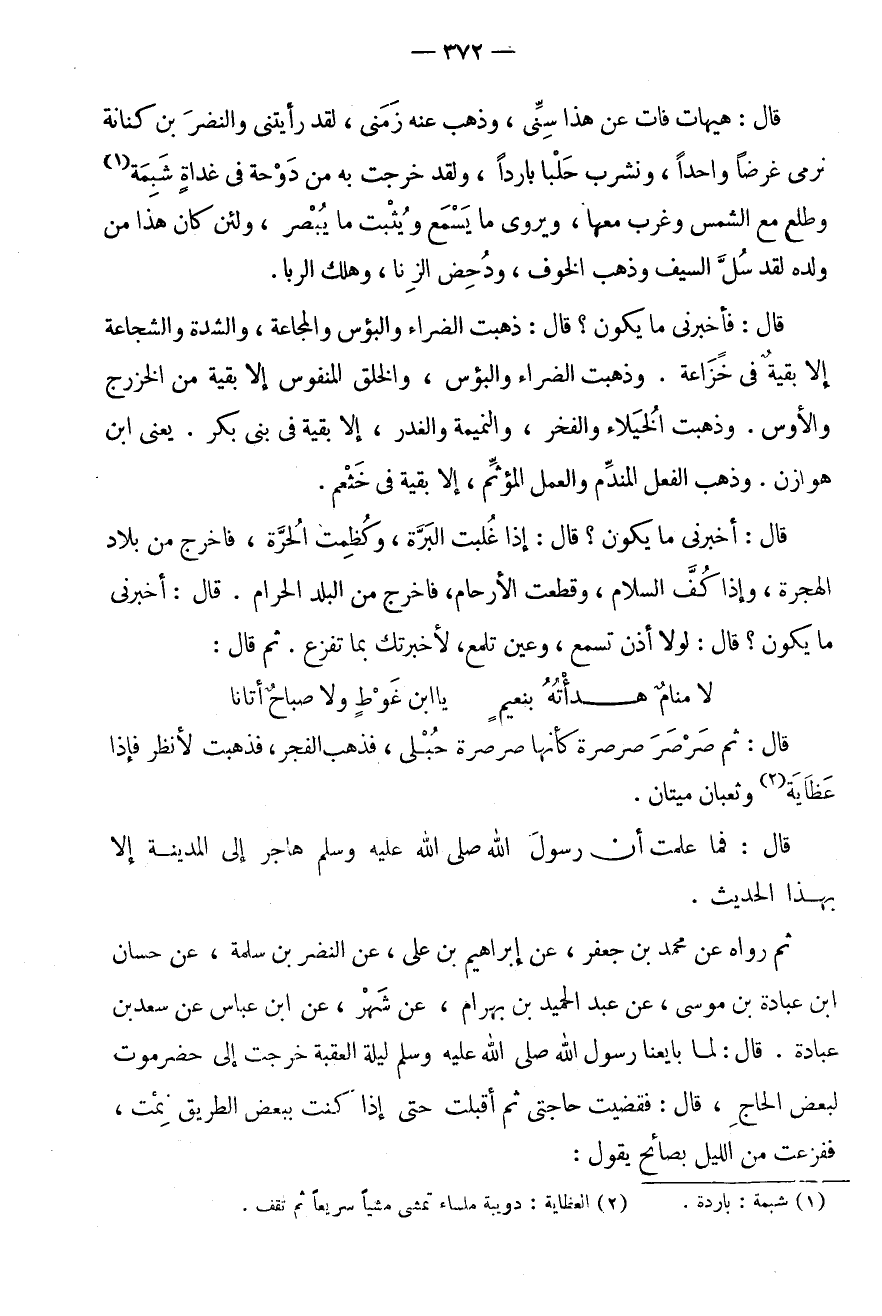 قَالَ: هَيْهَاتَ فَاتَ عَنْ هَذَا سِنِّي، وَذَهَبَ عَنْهُ زَمَنِي، لَقَدْ رَأَيْتُنِي وَالنَّضْرَ بْنَ كِنَانَةَ نَرْمِي غَرَضًا وَاحِدًا، وَنَشْرَبُ حَلَبًا بَارِدًا، وَلَقَدْ خَرَجْتُ بِهِ مِنْ دَوْحَةٍ فِي غَدَاةٍ شَبِمَةٍ (1) وطلع مَعَ الشَّمْس وَغرب مَعهَا، ويروى مَا يَسْمَعُ وَيُثْبِتُ مَا يُبْصِرُ، وَلَئِنْ كَانَ هَذَا مِنْ وَلَدِهِ لَقَدْ سُلَّ السَّيْفُ وَذَهَبَ الْخَوْفُ، وَدُحِضَ الزِّنَا، وَهَلَكَ الرِّبَا.