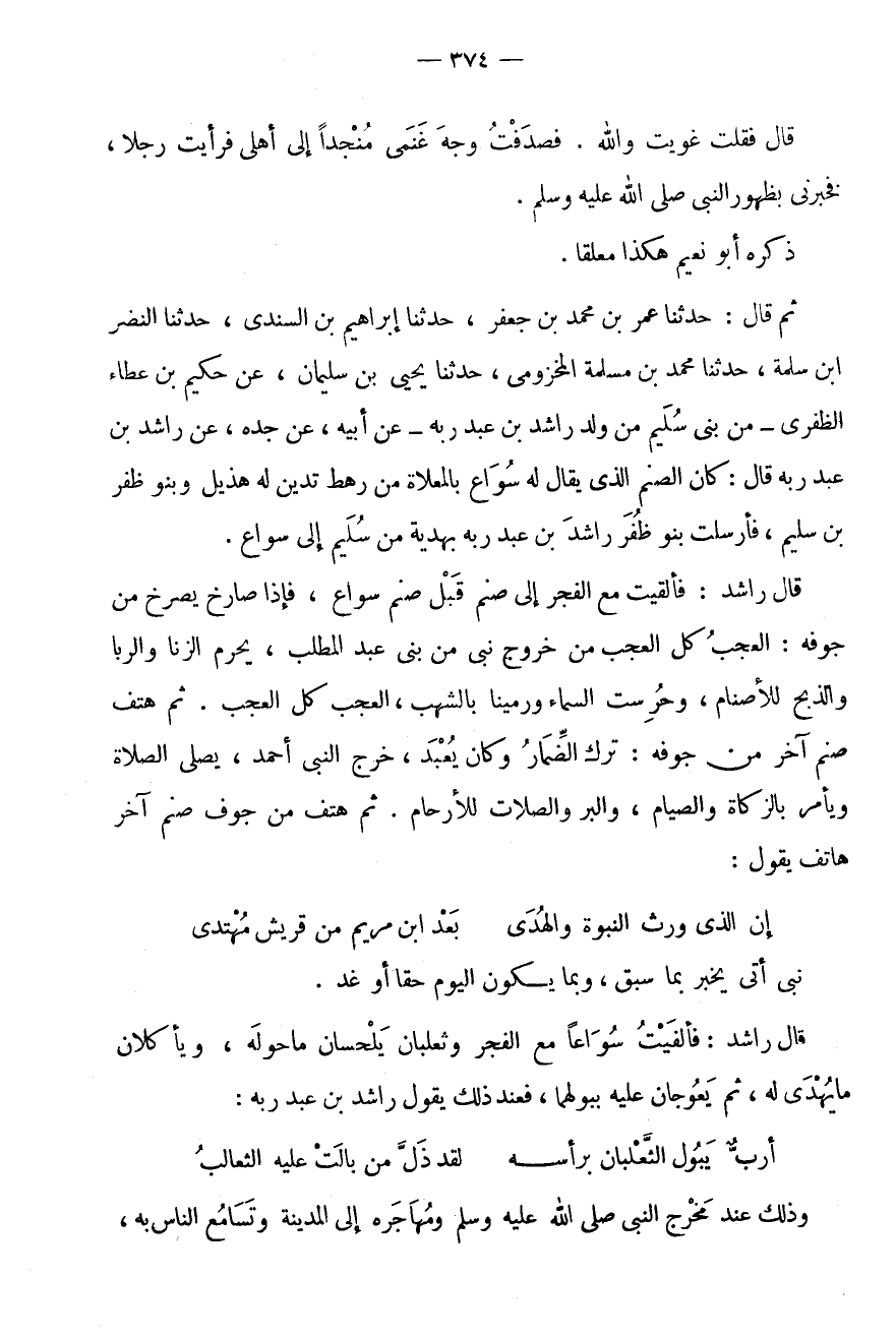 قَالَ رَاشِدٌ: فَأَلْقَيْتُ مَعَ الْفَجْرِ إِلَى صَنَمٍ قَبْلَ صَنَمِ سُوَاعٍ، فَإِذَا صَارِخٌ يَصْرُخُ مِنْ جَوْفِهِ: الْعَجَبُ كُلُّ الْعَجَبْ مِنْ خُرُوجِ نَبِيٍّ مِنْ بَنِي عَبْدِ الْمُطَّلِبْ، يُحَرِّمُ الزِّنَا وَالرِّبَا وَالذَّبْحَ لِلْأَصْنَامِ، وَحُرِسَتِ السَّمَاءُ وَرُمِينَا بِالشُّهُبْ، الْعَجَبُ كُلُّ الْعَجَبْ.