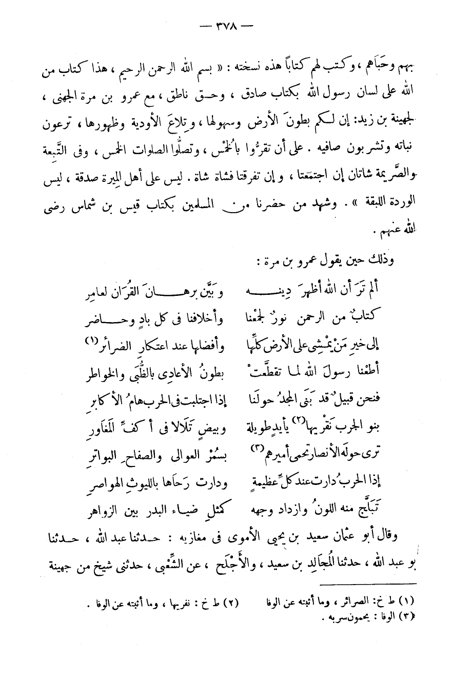 وَذَلِكَ حِينَ يَقُولُ عَمْرُو بْنُ مُرَّةَ: أَلَمْ تَرَ أَنَّ اللَّهَ أَظْهَرَ دِينَهُ * وَبَيَّنَ بُرْهَانَ الْقُرَانِ لِعَامِرِ كتاب من الرَّحْمَن نور لجمعنا * وأخلافنا فِي كُلِّ بَادٍ وَحَاضِرِ إِلَى خَيْرِ مَنْ يَمْشِي عَلَى الْأَرْضِ كُلِّهَا * وَأَفْضَلِهَا عِنْدَ اعْتِكَارِ الضَّرَائِرِ (1) أَطَعْنَا رَسُولَ اللَّهِ لَمَّا تَقَطَّعَتْ * بُطُونُ الاعادي بالظبى وَالْخَوَاطِرِ فَنَحْنُ قَبِيلٌ قَدْ بُنِيَ الْمَجْدُ حَوْلَنَا * إِذا اجتلبت فِي الْحَرْب هام الاكابر بَنو الجرب نقريها (2) يأيد طَوِيلَةٍ * وَبِيضٍ تَلَأْلَأَ فِي أَكُفِّ الْمَغَاوِرِ تَرَى حَوْلَهُ الْأَنْصَارَ تَحْمِي أَمِيرَهُمْ (3) * بِسُمْرِ الْعَوَالِي وَالصِّفَاحِ الْبَوَاتِرِ إِذَا الْحَرْبُ دَارَتْ عِنْدَ كُلِّ عَظِيمَةٍ * وَدَارَتْ رَحَاهَا بِاللِّيُوثِ الْهَوَاصِرِ تَبَلَّجَ مِنْهُ اللَّوْنُ وَازْدَادَ وَجْهُهُ * كَمِثْلِ ضِيَاءِ الْبَدْرِ بَيْنَ الزَّوَاهِرِ وَقَالَ أَبُو عُثْمَانَ سَعِيدُ بْنُ يَحْيَى الْأُمَوِيُّ فِي مَغَازِيهِ: حَدَّثَنَا عبد الله، حَدثنَا بو عَبْدِ اللَّهِ، حَدَّثَنَا الْمُجَالِدُ بْنُ سَعِيدٍ، وَالْأَجْلَحُ، عَن الشعبى، حَدَّثَنى شيخ من جُهَيْنَة