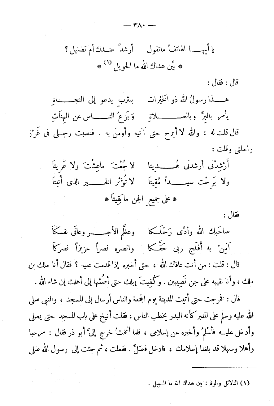فَنصبت رجلى غَرْزِ رَاحِلَتِي وَقُلْتُ: أَرْشِدْنِي أَرْشِدْنِي هُدِيتَا * لَا جُعْتَ مَا عِشْتَ وَلَا عَرِيتَا وَلَا بَرِحْتَ سيدا مقيتا * لَو تُؤْثِرِ الْخَيْرَ الَّذِي أُتِيتَا * عَلَى جَمِيعِ الْجِنِّ مَا بَقِيَتَا * فَقَالَ: صَاحَبَكَ اللَّهُ وَأَدَّى رَحْلَكَا * وَعَظَّمَ الْأَجْرَ وَعَافَى نَفْسَكَا آمِنْ بِهِ أَفْلَجَ ربى حقكا * وانصره نصرا عَزِيزًا نَصْرَكَا قَالَ: قُلْتُ: مَنْ أَنْتَ عَافَاكَ اللَّهُ، حَتَّى أُخْبِرَهُ إِذَا قَدِمْتَ عَلَيْهِ؟ فَقَالَ أَنَا ملك بن ملك، وَأَنَا نَقِيبُهُ عَلَى جِنِّ نَصِيبِينَ.