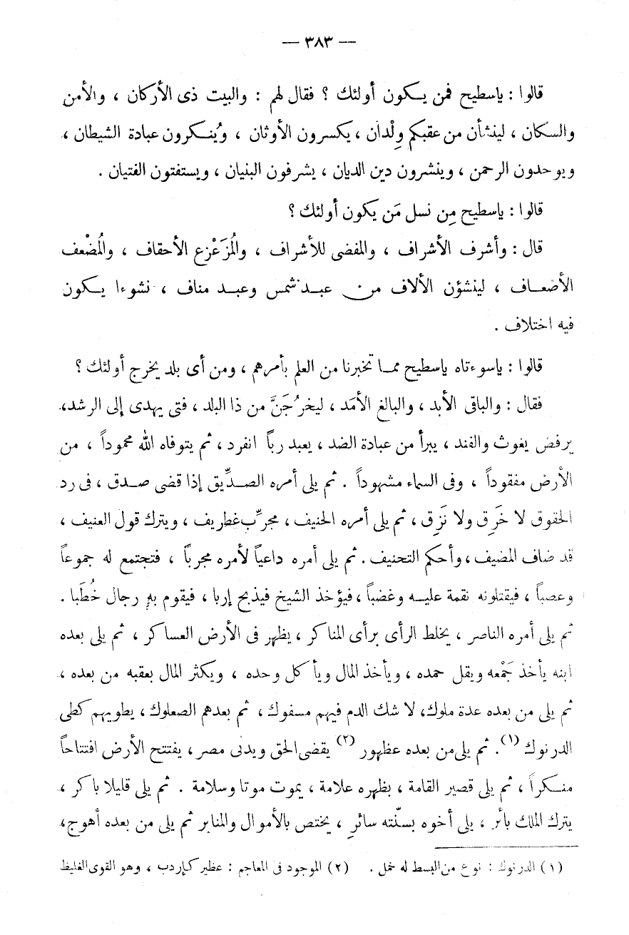 قَالُوا: يَا سَطِيحُ فَمِنْ يَكُونُ أُولَئِكَ؟ فَقَالَ لَهُم: وَالْبَيْت ذى الاركان، والامن والسكان، لينشأن مِنْ عَقِبِكُمْ وِلْدَانٌ، يَكْسِرُونَ الْأَوْثَانَ، وَيُنْكِرُونَ عِبَادَةَ الشَّيْطَانِ، وَيُوَحِّدُونَ الرَّحْمَنَ، وَيَنْشُرُونَ دِينَ الدَّيَّانِ، يُشْرِفُونَ الْبُنْيَانَ، وَيَسْتَفْتُونَ الْفِتْيَانَ.