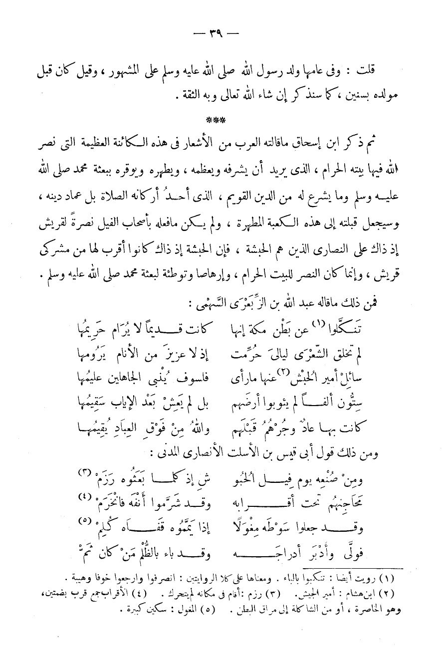 ثُمَّ ذَكَرَ ابْنُ إِسْحَاقَ مَا قَالَتْهُ الْعَرَبُ مِنَ الْأَشْعَارِ فِي هَذِهِ الْكَائِنَةِ الْعَظِيمَةِ الَّتِي نَصَرَ اللَّهُ فِيهَا بَيْتَهُ الْحَرَامَ، الَّذِي يُرِيدُ أَنْ يُشَرِّفَهُ وَيُعَظِّمَهُ، وَيُطَهِّرَهُ وَيُوَقِّرَهُ بِبَعْثَةِ مُحَمَّدٍ صَلَّى اللَّهُ عَلَيْهِ وَسَلَّمَ وَمَا يُشْرَعُ لَهُ مِنَ الدِّينِ الْقَوِيمِ، الَّذِي أَحَدُ أَرْكَانِهِ الصَّلَاةُ بَلْ عِمَادُ دِينِهِ، وَسَيَجْعَلُ قِبْلَتَهُ إِلَى هَذِهِ الْكَعْبَةِ الْمُطَهَّرَةِ، وَلَمْ يَكُنْ مَا فَعَلَهُ بِأَصْحَابِ الْفِيلِ نُصْرَةً لِقُرَيْشٍ إِذْ ذَاكَ عَلَى النَّصَارَى الَّذِينَ هُمُ الْحَبَشَةُ، فَإِنَّ الْحَبَشَةَ إِذْ ذَاكَ كَانُوا أَقْرَبَ لَهَا مِنْ مُشْرِكِي قُرَيْشٍ، وَإِنَّمَا كَانَ النَّصْرُ لِلْبَيْتِ الْحَرَامِ، وَإِرْهَاصًا وَتَوْطِئَةً لِبَعْثَةِ مُحَمَّدٍ صَلَّى اللَّهُ عَلَيْهِ وَسَلَّمَ.