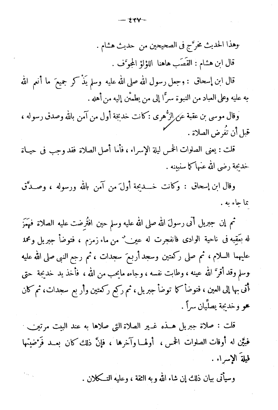 ثُمَّ إِنَّ جِبْرِيلَ أَتَى رَسُولَ اللَّهِ صَلَّى اللَّهُ عَلَيْهِ وَسَلَّمَ حِينَ افْتُرِضَتْ عَلَيْهِ الصَّلَاةُ فَهَمَزَ لَهُ بِعَقِبِهِ فِي نَاحِيَةِ الْوَادِي فَانْفَجَرَتْ لَهُ عَيْنٌ مِنْ مَاءِ زَمْزَمَ، فَتَوَضَّأَ جِبْرِيلُ وَمُحَمَّدٌ عَلَيْهِمَا السَّلَامُ، ثُمَّ صَلَّى رَكْعَتَيْنِ وَسَجَدَ أَرْبَعَ سَجَدَاتٍ، ثُمَّ رَجَعَ النَّبِيُّ صَلَّى اللَّهُ عَلَيْهِ وَسَلَّمَ وَقَدْ أَقَرَّ اللَّهُ عَيْنَهُ، وَطَابَتْ نَفْسُهُ، وَجَاءَهُ مَا يُحِبُّ من الله، فَأخذ يَد خَدِيجَةَ حَتَّى أَتَى بِهَا إِلَى الْعَيْنِ، فَتَوَضَّأَ كَمَا تَوَضَّأَ جِبْرِيلُ، ثُمَّ رَكَعَ رَكْعَتَيْنِ وَأَرْبَعَ سَجَدَاتٍ، ثُمَّ كَانَ هُوَ وَخَدِيجَةُ يُصَلِّيَانِ سِرًّا.
