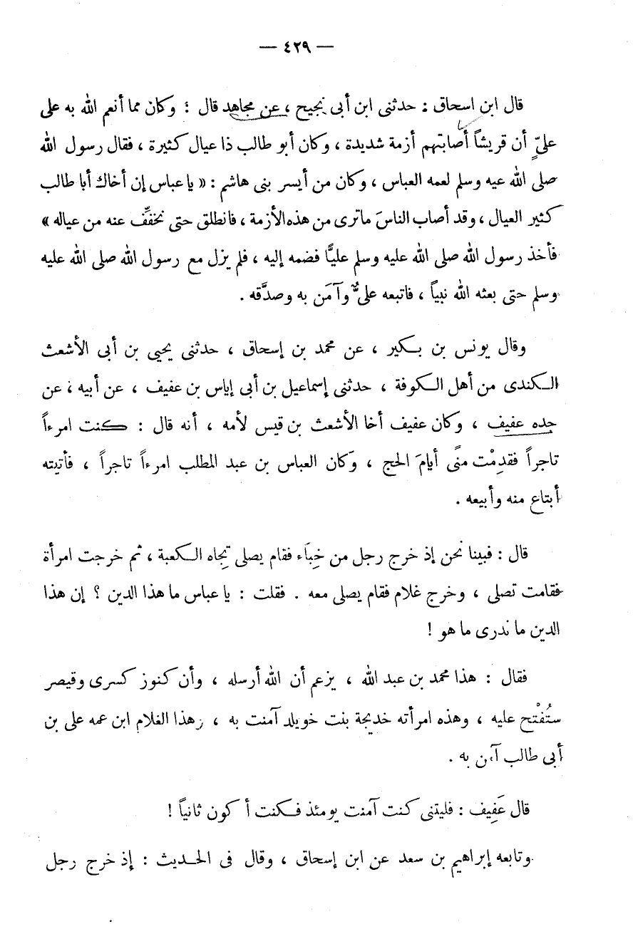 فَقُلْتُ: يَا عَبَّاسُ مَا هَذَا الدِّينُ؟ إِنَّ هَذَا الدِّينَ مَا نَدْرِي مَا هُوَ! فَقَالَ: هَذَا مُحَمَّدُ بْنُ عَبْدِ اللَّهِ، يَزْعُمُ أَنَّ اللَّهَ أَرْسَلَهُ، وَأَنَّ كُنُوزَ كِسْرَى وَقَيْصَرَ سَتُفْتَحُ عَلَيْهِ، وَهَذِهِ امْرَأَتُهُ خَدِيجَةُ بِنْتُ خُوَيْلِدٍ آمَنَتْ بِهِ، وَهَذَا الْغُلَامُ ابْنُ عَمِّهِ عَلِيُّ بْنُ أَبِي طَالِبٍ آمَنَ بِهِ.