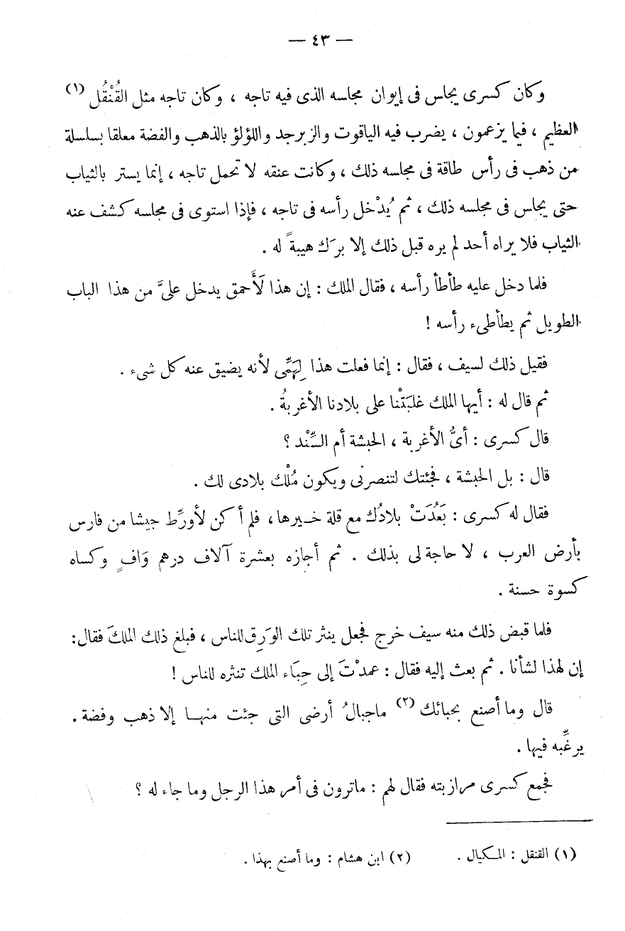 قَالَ كِسْرَى: أَيُّ الْأَغْرِبَةِ، الْحَبَشَةُ أَمِ السِّنَدُ؟ قَالَ: بَلِ الْحَبَشَةُ، فَجِئْتُكَ لِتَنْصُرَنِي وَيَكُونُ مُلْكُ بِلَادِي لَكَ.