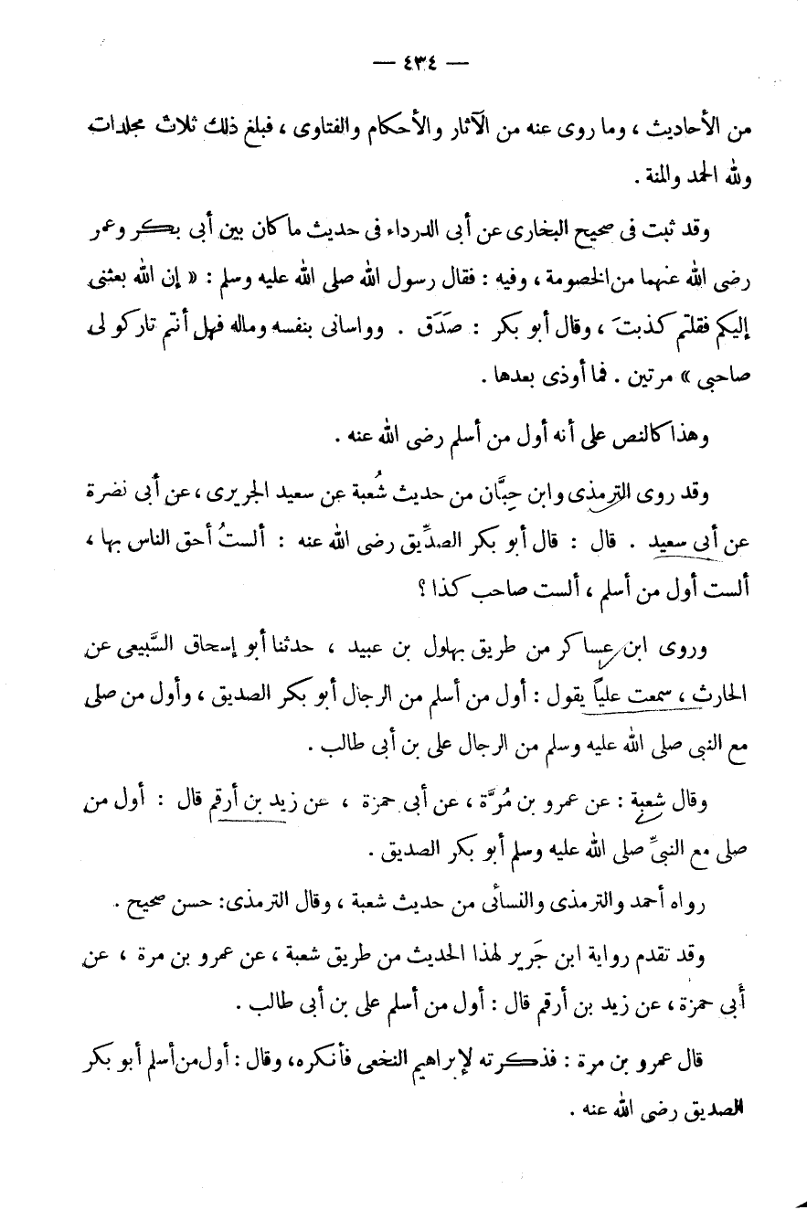 قَالَ: قَالَ أَبُو بَكْرٍ الصِّدِّيقُ رَضِيَ اللَّهُ عَنْهُ: أَلَسْتُ أَحَقَّ النَّاسِ بِهَا، أَلَسْتُ أَوَّلَ مَنْ أَسْلَمَ، أَلَسْتُ صَاحِبَ كَذَا؟ وَرَوَى ابْنُ عَسَاكِرَ مِنْ طَرِيقِ بُهْلُولِ بْنِ عُبَيْدٍ، حَدَّثَنَا أَبُو إِسْحَاقَ السَّبِيعِيُّ عَنِ الْحَارِثِ، سَمِعْتُ عَلِيًّا يَقُولُ: أَوَّلُ مَنْ أَسْلَمَ مِنَ الرِّجَالِ أَبُو بَكْرٍ الصِّدِّيقُ، وَأَوَّلُ مَنْ صَلَّى مَعَ النَّبِيِّ صَلَّى اللَّهُ عَلَيْهِ وَسَلَّمَ مِنَ الرِّجَالِ عَلِيُّ بْنُ أَبِي طَالِبٍ.