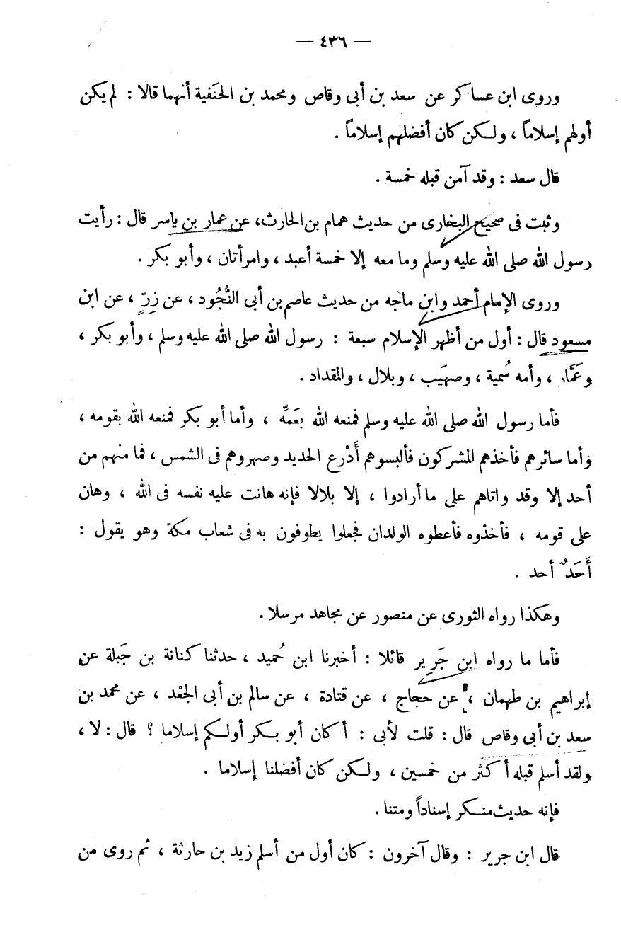 وَرَوَى ابْنُ عَسَاكِرَ عَنْ سَعْدِ بْنِ أَبِي وَقَّاصٍ وَمُحَمَّدِ بْنِ الْحَنَفِيَّةِ أَنَّهُمَا قَالَا: لَمْ يَكُنْ أَوَّلَهُمْ إِسْلَامًا، وَلَكِنْ كَانَ أَفْضَلَهُمْ إِسْلَامًا.