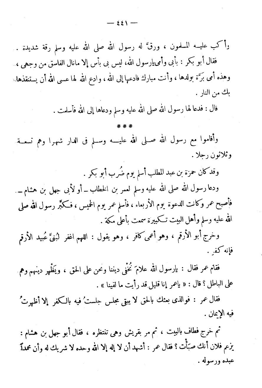 وَدَعَا رَسُولُ اللَّهِ صَلَّى اللَّهُ عَلَيْهِ وَسَلَّمَ لِعُمَرَ بْنِ الْخَطَّابِ - أَو لابي جَهْلِ بْنِ هِشَامٍ - فَأَصْبَحَ عُمَرُ وَكَانَتِ الدَّعْوَةُ يَوْمَ الْأَرْبِعَاءِ، فَأَسْلَمَ عُمَرُ يَوْمَ الْخَمِيسِ، فَكَبَّرَ رَسُولُ اللَّهِ صَلَّى اللَّهُ عَلَيْهِ وَسَلَّمَ وَأَهْلُ الْبَيْتِ تَكْبِيرَةً سُمِعَتْ بِأَعْلَى مَكَّةَ.