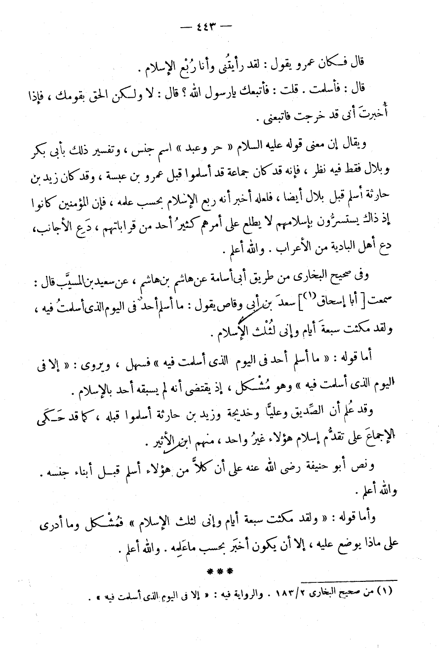 وَيُقَالُ إِنَّ مَعْنَى قَوْلِهِ عَلَيْهِ السَّلَامُ " حُرٌّ وَعَبْدٌ " اسْمُ جِنْسٍ، وَتَفْسِيرُ ذَلِكَ بِأَبِي بَكْرٍ وَبِلَالٍ فَقَطْ فِيهِ نَظَرٌ، فَإِنَّهُ قَدْ كَانَ جَمَاعَةٌ قَدْ أَسْلَمُوا قَبْلَ عَمْرِو بْنِ عَبَسَةَ، وَقَدْ كَانَ زَيْدُ بْنُ حَارِثَةَ أَسْلَمَ قَبْلَ بِلَالٍ أَيْضًا، فَلَعَلَّهُ أَخْبَرَ أَنَّهُ رُبُعُ الْإِسْلَامِ بِحَسَبِ علمه، فَإِن الْمُؤمنِينَ كَانُوا إِذْ ذَاكَ يَسْتَسِرُّونَ بِإِسْلَامِهِمْ لَا يَطَّلِعُ على أَمرهم كثيرا أَحَدٍ مِنْ قَرَابَاتِهِمْ، دَعِ الْأَجَانِبَ، دَعْ أَهْلَ الْبَادِيَةِ مِنَ الْأَعْرَابِ.