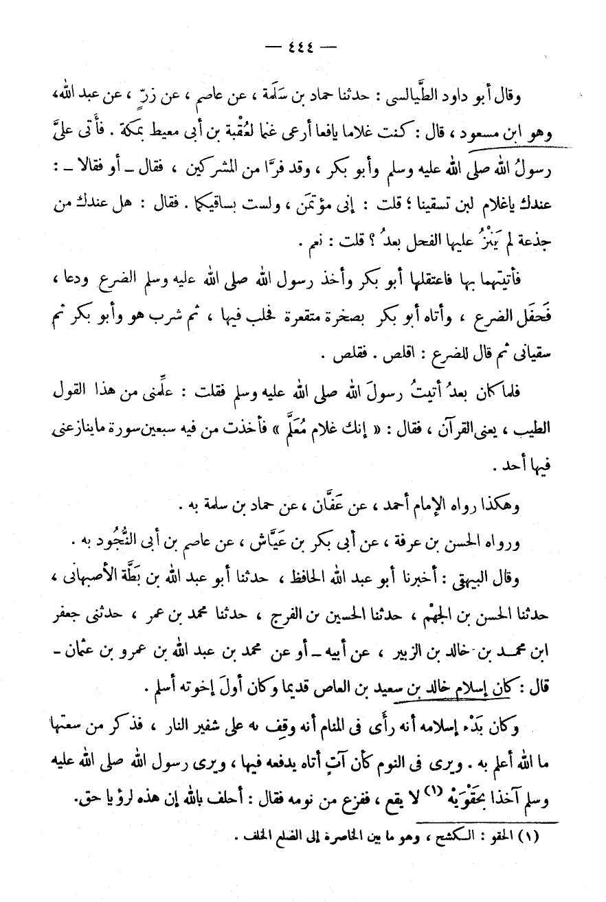 وَقَالَ أَبُو دَاوُدَ الطَّيَالِسِيُّ: حَدَّثَنَا حَمَّادُ بْنُ سَلَمَةَ، عَنْ عَاصِمٍ، عَنْ زِرٍّ، عَنْ عَبْدِ اللَّهِ، وَهُوَ ابْنُ مَسْعُودٍ، قَالَ: كُنْتُ غُلَامًا يَافِعًا أَرْعَى غَنَمًا لِعُقْبَةَ بْنِ أَبِي مُعَيْطٍ بِمَكَّةَ.