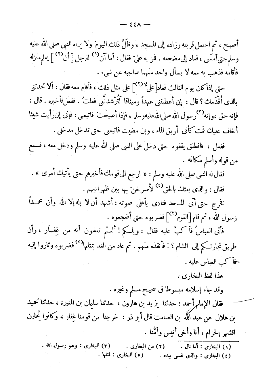 حَتَّى إِذَا كَانَ يَوْمُ الثَّالِثِ فَعَادَ [عَلِيٌّ (2) ] عَلِيٌّ مِثْلَ ذَلِكَ، فَأَقَامَ مَعَهُ فَقَالَ: أَلَا تُحَدِّثنِي بالذى أقدمك؟ قَالَ: إِن أَعْطَيْتنِي عهدا وميثاقا لترشدنني فَعَلْتُ.