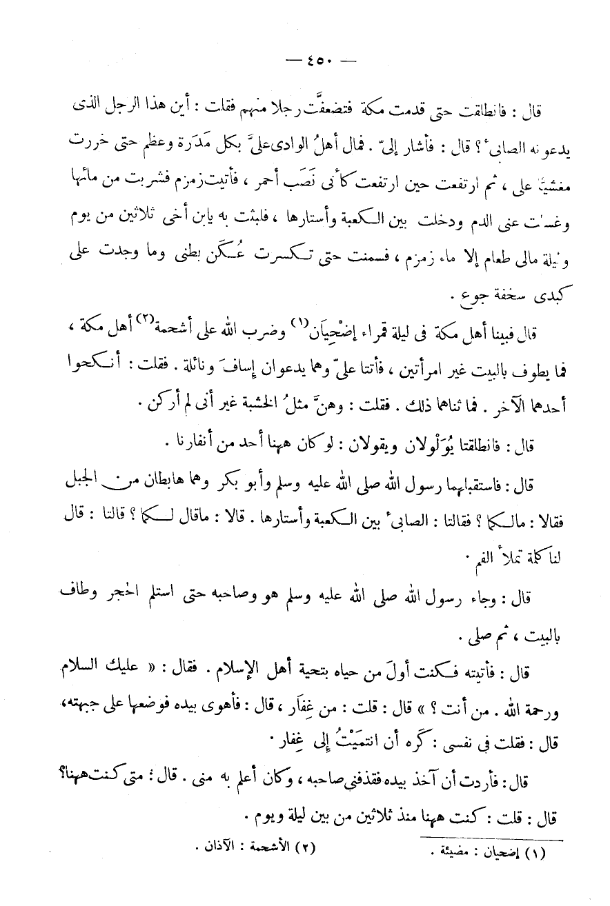 فَمَالَ أَهْلُ الْوَادِي عَلَيَّ بِكُلِّ مَدَرَةٍ وَعَظْمٍ حَتَّى خَرَرْت مغشيا على، ثمَّ ارْتَفَعت حِينَ ارْتَفَعْتُ كَأَنِّي نُصُبٌ أَحْمَرُ، فَأَتَيْتُ زَمْزَمَ فَشَرِبْتُ مِنْ مَائِهَا وَغَسَلْتُ عَنِّي الدَّمَ وَدَخَلْتُ بَيْنَ الْكَعْبَةِ وَأَسْتَارِهَا، فَلَبِثْتُ بِهِ يَا بْنَ أخى ثَلَاثِينَ من يَوْم وَلَيْلَة مالى طَعَامٌ إِلَّا مَاءُ زَمْزَمَ، فَسَمِنْتُ حَتَّى تَكَسَّرَتْ عُكَنُ بَطْنِي وَمَا وَجَدْتُ عَلَى كَبِدِي سُخْفَةَ جُوعٍ.