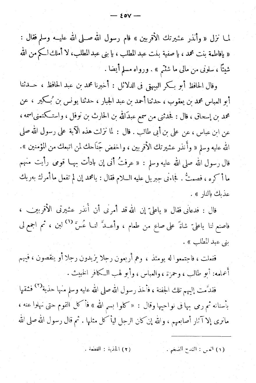 قَالَ: فَدَعَانِي فَقَالَ " يَا عَلِيُّ إِنَّ اللَّهَ قَدْ أَمَرَنِي أَنْ أُنْذِرَ عَشِيرَتِيَ الْأَقْرَبِينَ، فَاصْنَعْ لَنَا يَا عَلِيُّ شَاةً عَلَى صَاعٍ مِنْ طَعَامٍ، وَأَعِدَّ لَنَا عُسَّ (1) لَبَنٍ، ثُمَّ اجْمَعْ لِي بنى عبد الْمطلب ".