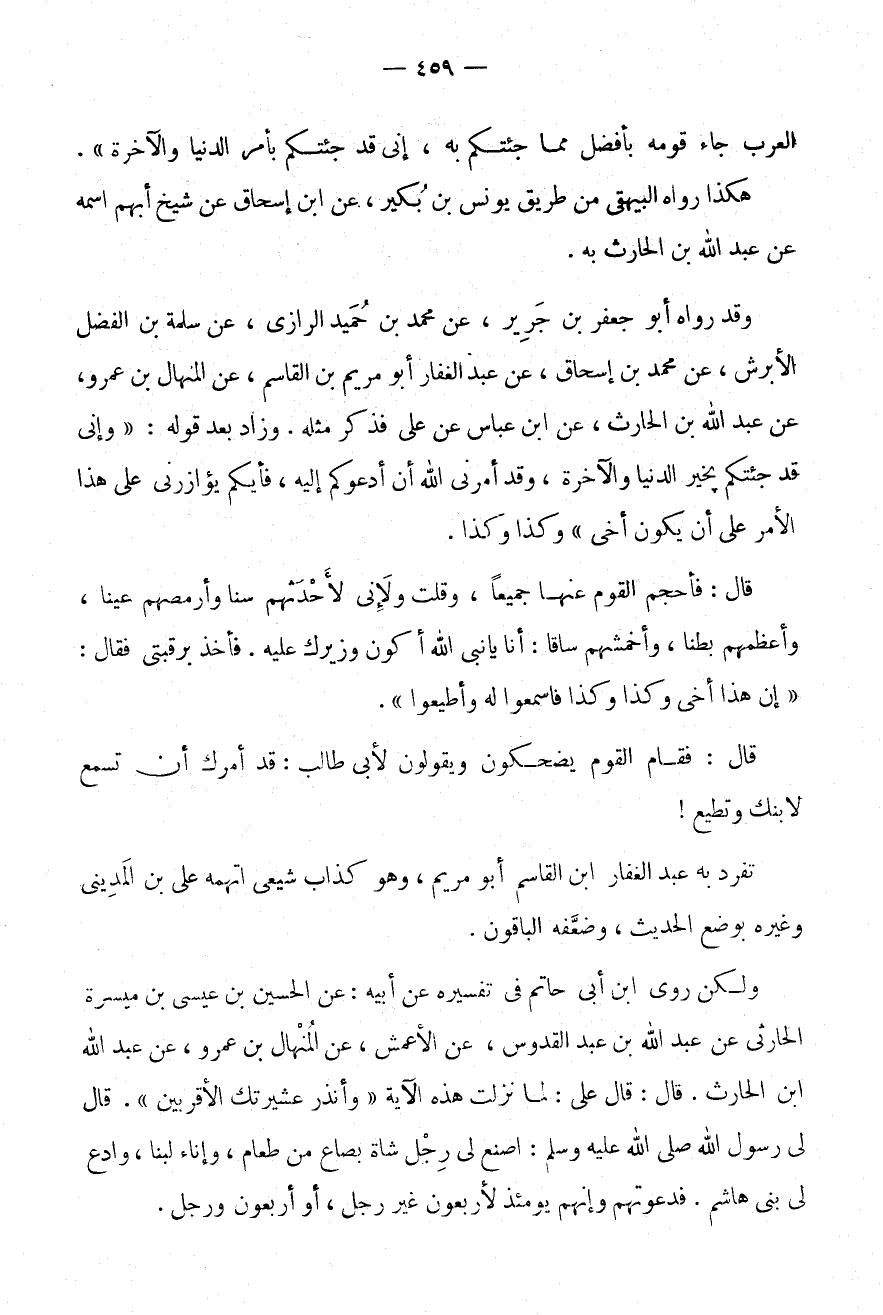 قَالَ: فَقَامَ الْقَوْمُ يَضْحَكُونَ وَيَقُولُونَ لِأَبِي طَالِبٍ: قَدْ أَمَرَكَ أَنْ تَسْمَعَ لِابْنِكَ وَتُطِيعَ! تَفَرَّدَ بِهِ عَبْدُ الْغفار ابْن الْقَاسِمِ أَبُو مَرْيَمَ، وَهُوَ كَذَّابٌ شِيعِيٌّ اتَّهَمَهُ عَلِيُّ بْنُ الْمَدِينِيِّ وَغَيْرُهُ بِوَضْعِ الْحَدِيثِ، وَضَعَّفَهُ الْبَاقُونَ.
