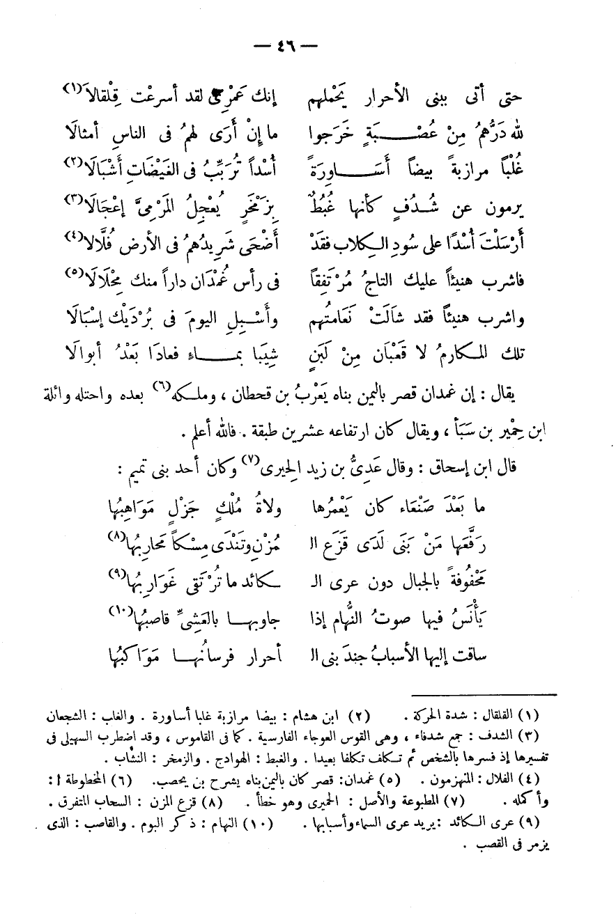 يَرْمُونَ عَنْ شُدُفٍ كَأَنَّهَا غُبُطٌ * بِزَمْخَرٍ يُعَجِّلُ الْمَرْمِيَّ إِعْجَالَا (3) أَرْسَلْتَ أُسْدًا عَلَى سُودِ الْكِلَابِ فَقَدْ * أَضْحَى شَرِيدُهُمُ فِي الْأَرْضِ فَلَّالَا (4) فَاشْرَبْ هَنِيئًا عَلَيْكَ التَّاجُ مُرْتَفِقًا * فِي رَأْسِ غُمْدَانَ دَارًا مِنْكَ مِحْلَالَا (5) وَاشْرَبْ هَنِيئًا فَقَدْ شَالَتْ نَعَامَتُهُمْ * وَأَسْبِلِ الْيَومَ فِي بُرْدَيْكَ إِسْبَالًا تِلْكَ الْمَكَارِمُ لَا قَعْبَانِ مِنْ لَبَنٍ * شِيبَا بِمَاءٍ فَعَادَا بَعْدُ أَبْوَالَا يُقَالَ: إِنَّ غُمْدَانَ قَصْرٌ بِالْيَمَنِ بِنَاهُ يَعْرُبُ بْنُ قحطان، وَملكه (6) بعده واحتله وائلة ابْن حِمْيَرَ بْنِ سَبَأٍ، وَيُقَالَ كَانَ ارْتِفَاعُهُ عِشْرِينَ طَبَقَةً.