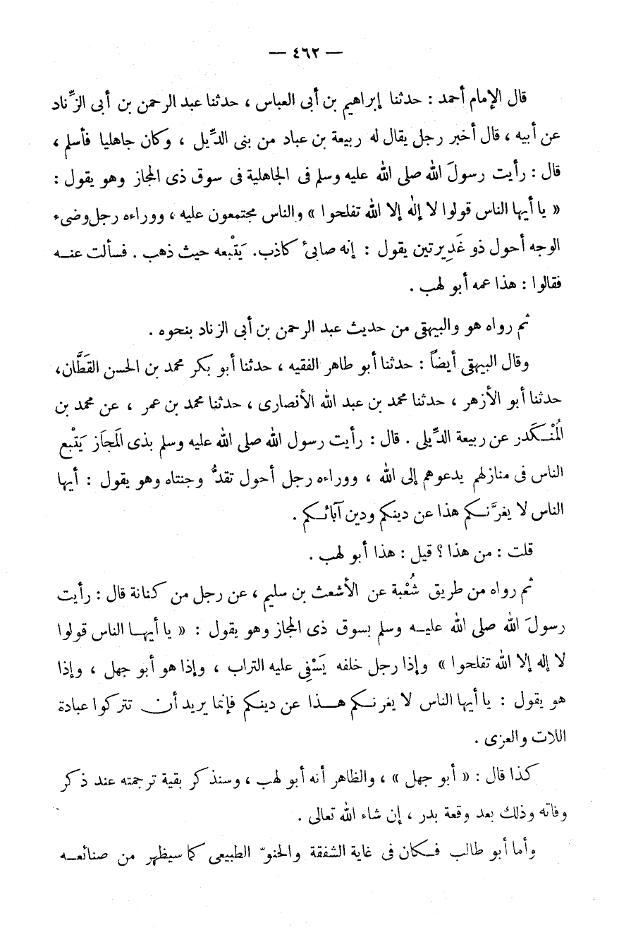قَالَ الْإِمَامُ أَحْمَدُ: حَدَّثَنَا إِبْرَاهِيمُ بْنُ أَبِي الْعَبَّاسِ، حَدَّثَنَا عَبْدِ الرَّحْمَنِ بْنِ أَبِي الزِّنَادِ عَنْ أَبِيهِ، قَالَ أخبر رجل يُقَال لَهُ ربيعَة بن عباد من بَنِي الدِّيلِ، وَكَانَ جَاهِلِيًّا فَأَسْلَمَ، قَالَ: رَأَيْتُ رَسُولَ اللَّهِ صَلَّى اللَّهُ عَلَيْهِ وَسَلَّمَ فِي الْجَاهِلِيَّةِ فِي سُوقِ ذِي الْمَجَازِ وَهُوَ يَقُولُ: " يَا أَيُّهَا النَّاسُ قُولُوا لَا إِلَهَ إِلَّا اللَّهُ تُفْلِحُوا " وَالنَّاسُ مُجْتَمِعُونَ عَلَيْهِ، وَوَرَاءَهُ رَجُلٌ وضئ الْوَجْهِ أَحْوَلُ ذُو غَدِيرَتَيْنِ يَقُولُ: إِنَّهُ صَابِئٌ كَاذِبٌ.
