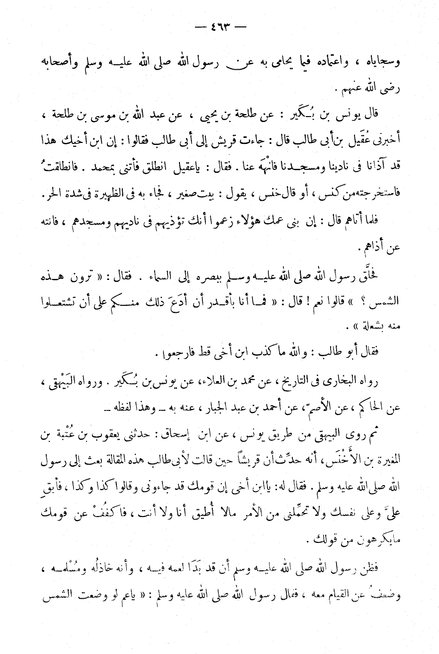 قَالَ يُونُسُ بْنُ بُكَيْرٍ: عَنْ طَلْحَةَ بْنِ يَحْيَى، عَن عبد الله بن مُوسَى بْنِ طَلْحَةَ، أَخْبَرَنِي عَقِيلُ بْنُ أَبِي طَالِبٍ قَالَ: جَاءَتْ قُرَيْشٌ إِلَى أَبِي طَالِبٍ فَقَالُوا: إِنَّ ابْنَ أَخِيكَ هَذَا قَدْ آذَانَا فِي نَادِينَا وَمَسْجِدِنَا فَانْهَهُ عَنَّا.