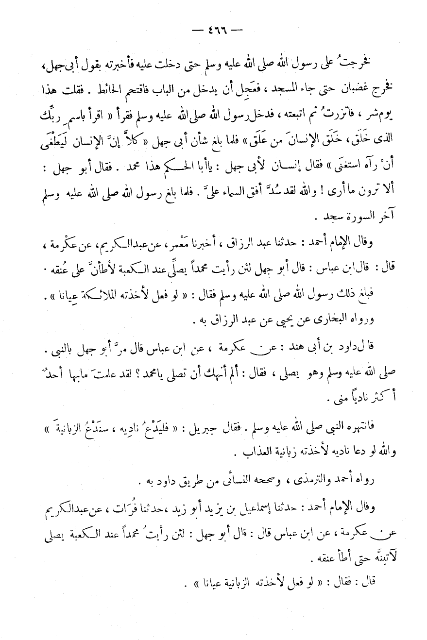 فَقُلْتُ هَذَا يَوْمُ شَرٍّ، فَاتَّزَرْتُ ثُمَّ اتَّبَعْتُهُ، فَدَخَلَ رَسُولِ اللَّهِ صَلَّى اللَّهُ عَلَيْهِ وَسَلَّمَ فَقَرَأَ " اقْرَأْ بِاسْمِ رَبِّكَ الَّذِي خَلَقَ، خَلَقَ الْإِنْسَانَ من علق " فَلَمَّا بلغ شَأْن أَبى جهل " كَلَّا إِنَّ الْإِنْسَانَ لَيَطْغَى أَنْ رَآهُ اسْتَغْنَى " فَقَالَ إِنْسَانٌ لِأَبِي جَهْلٍ: يَا أَبَا الْحَكَمِ هَذَا مُحَمَّدٌ.