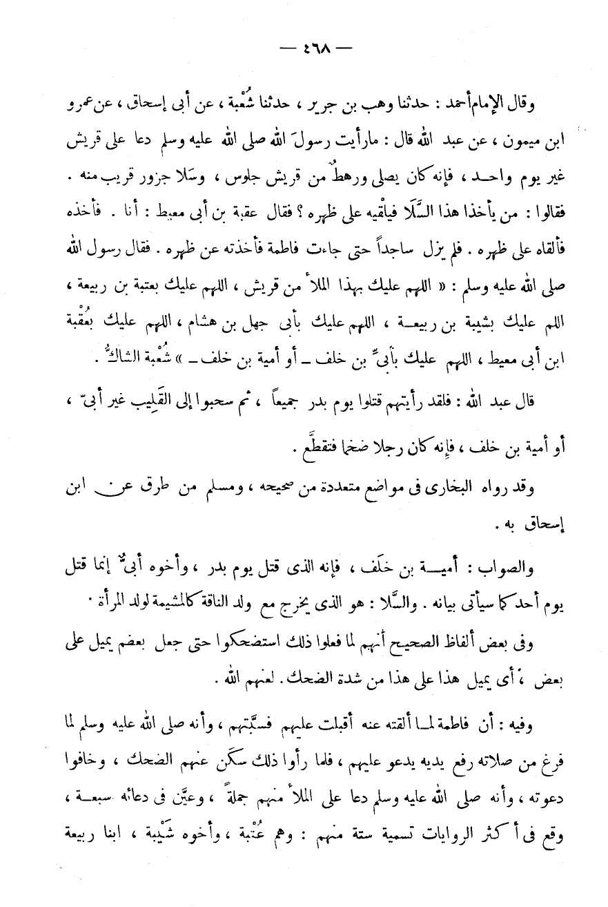 وَقَالَ الْإِمَامُ أَحْمَدُ: حَدَّثَنَا وَهْبُ بْنُ جَرِيرٍ، حَدَّثَنَا شُعْبَةُ، عَنْ أَبِي إِسْحَاقَ، عَنْ عَمْرِو ابْن مَيْمُونٍ، عَنْ عَبْدِ اللَّهِ قَالَ: مَا رَأَيْتُ رَسُولَ اللَّهِ صَلَّى اللَّهُ عَلَيْهِ وَسَلَّمَ دَعَا عَلَى قُرَيْشٍ غَيْرَ يَوْمٍ وَاحِدٍ، فَإِنَّهُ كَانَ يصلى ورهط من قُرَيْش جُلُوس، وسلا جزور قريب مِنْهُ.