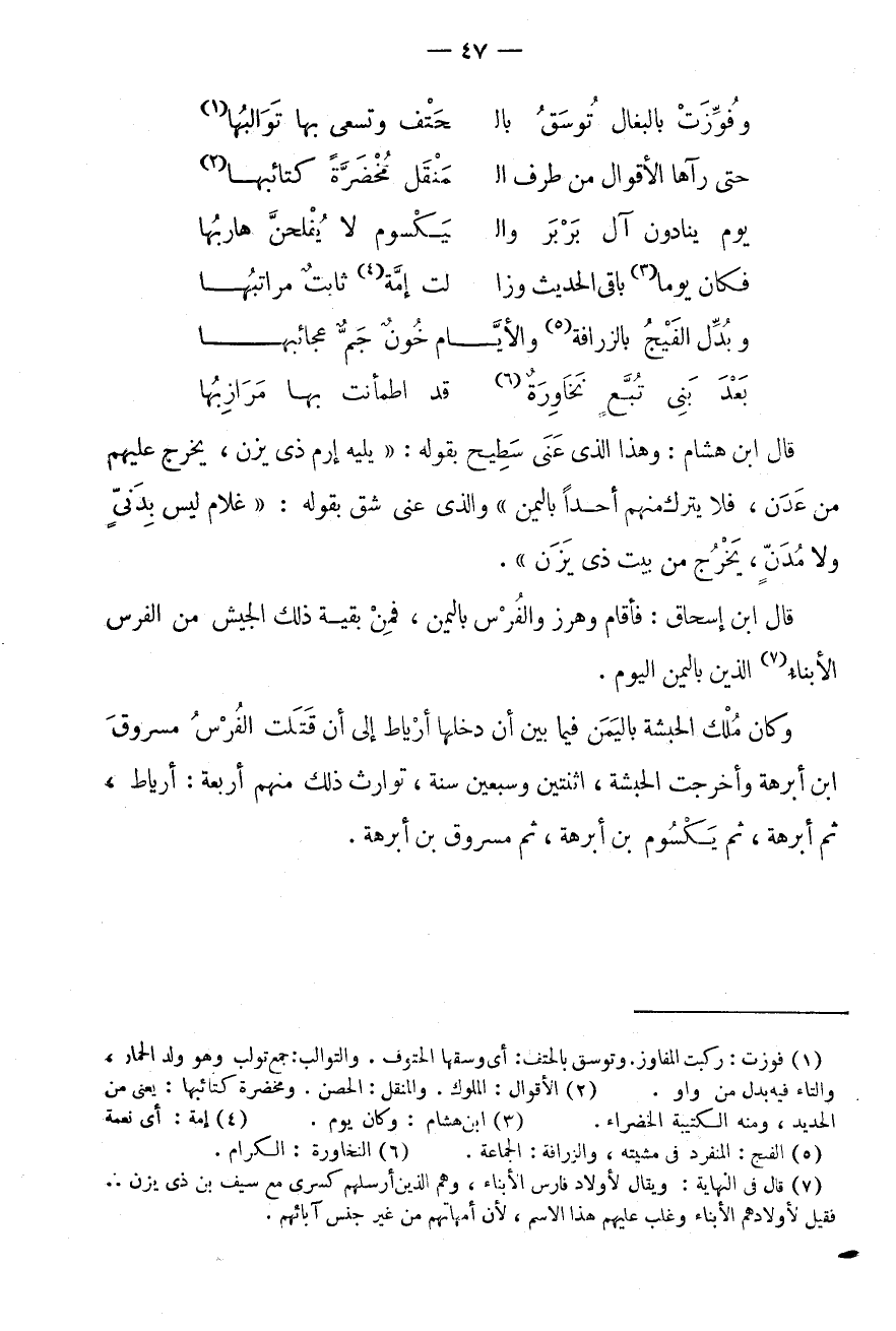 (7) قَالَ فِي النِّهَايَة: وَيُقَال لاولاد فَارس الابناء، وهم الَّذين أرسلهم كسْرَى مَعَ سيف بن ذى يزن.
