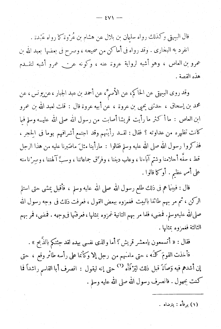 وَقَدْ رَوَى الْبَيْهَقِيُّ عَنِ الْحَاكِمِ، عَنِ الْأَصَمِّ، عَنْ أَحْمَدَ بْنِ عَبْدِ الْجَبَّارِ، عَنْ يُونُسَ، عَنْ مُحَمَّدِ بْنِ إِسْحَاقَ، حَدَّثَنِي يَحْيَى بْنُ عُرْوَةَ، عَنْ أَبِيهِ عُرْوَةَ قَالَ: قلت لعبد الله بن عَمْرو ابْن الْعَاصِ: مَا أَكْثَرُ مَا رَأَيْتَ قُرَيْشًا أَصَابَتْ مِنْ رَسُولِ اللَّهِ صَلَّى اللَّهُ عَلَيْهِ وَسَلَّمَ فِيمَا كَانَتْ تُظْهِرُهُ مِنْ عَدَاوَتِهِ؟ فَقَالَ: لَقَدْ رَأَيْتُهُمْ وَقَدِ اجْتَمَعَ أَشْرَافُهُمْ يَوْمًا فِي الْحِجْرِ، فَذَكَرُوا رَسُولِ اللَّهِ صَلَّى اللَّهُ عَلَيْهِ وَسَلَّمَ فَقَالُوا: مَا رَأَيْنَا مِثْلَ مَا صَبَرْنَا عَلَيْهِ مِنْ هَذَا الرَّجُلِ قَطُّ، سَفَّهَ أَحْلَامَنَا وَشَتَمَ آبَاءَنَا، وَعَابَ ديننَا، وَفرق جماعاتنا، وَسَب آلِهَتنَا، وصرنا مِنْهُ عَلَى أَمْرٍ عَظِيمٍ.