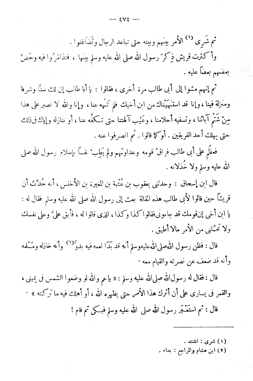 ثُمَّ إِنَّهُمْ مَشَوْا إِلَى أَبِي طَالِبٍ مَرَّةً أُخْرَى، فَقَالُوا: يَا أَبَا طَالِبٍ إِنَّ لَكَ سِنًّا وَشَرَفًا وَمَنْزِلَةً فِينَا، وَإِنَّا قَدِ اسْتَنْهَيْنَاكَ مِنَ ابْنِ أَخِيكَ فَلَمْ تَنْهَهُ عَنَّا، وَإِنَّا وَاللَّهِ لَا نَصْبِرُ عَلَى هَذَا مِنْ شَتْمِ آبَائِنَا، وَتَسْفِيهِ أَحْلَامِنَا، وَعَيْبِ آلِهَتِنَا حَتَّى تَكُفَّهُ عَنَّا، أَوْ نُنَازِلَهُ وَإِيَّاكَ فِي ذَلِكَ حَتَّى يَهْلِكَ أَحَدُ الْفَرِيقَيْنِ.