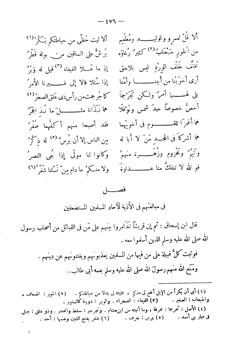 تخلف خلف الْورْد لَيْسَ بلاحق * إِذْ مَا عَلَا الْفَيْفَاءَ (3) قِيلَ لَهُ وَبْرُ أَرَى أَخَوَيْنَا مِنْ أَبِينَا وَأُمِّنَا * إِذَا سُئِلَا قَالَا إِلَى غَيْرِنَا الْأَمْرُ بَلَى لَهُمَا أَمْرٌ وَلَكِنْ تَجَرْجَمَا * كَمَا جَرْجَمَتْ مِنْ رَأْسِ ذِي عَلَقٍ الصَّخْرُ (4) أَخُصُّ خُصُوصًا عَبْدَ شَمْسٍ وَنَوْفَلًا * هُمَا نَبَذَانَا مِثْلَ مَا نُبِذَ الْجَمْرُ هُمَا أَغْمَزَا لِلْقَوْمِ فِي أَخَوَيْهِمَا * فَقَدْ أَصْبَحَا مِنْهُمْ أَكُفُّهُمَا صُفْرُ هُمَا أَشْرَكَا فِي الْمَجْدِ مَنْ لَا أَبَا لَهُ * مِنَ النَّاسِ إِلَّا أَنْ يُرَسَّ (5) لَهُ ذِكْرُ وَتَيْمٌ وَمَخْزُومٌ وَزُهْرَةُ مِنْهُمُ * وَكَانُوا لنا مولى إِذا بغى النَّصْر فو الله لَا تَنْفِكُّ مِنَّا عَدَاوَةٌ * وَلَا مِنْكُمُ مَا دَامَ من نسلنا شفر (6) فَصْلٌ فِي مُبَالَغَتِهِمْ فِي الْأَذِيَّةِ لِآحَادِ الْمُسْلِمِينَ الْمُسْتَضْعَفِينَ قَالَ ابْنُ إِسْحَاقَ: ثُمَّ إِنَّ قُرَيْشًا تَذَامَرُوا بَيْنَهُمْ عَلَى مَنْ فِي الْقَبَائِلِ مِنْ أَصْحَابِ رَسُولِ اللَّهِ صَلَّى اللَّهُ عَلَيْهِ وَسلم الَّذِينَ أَسْلَمُوا مَعَهُ.