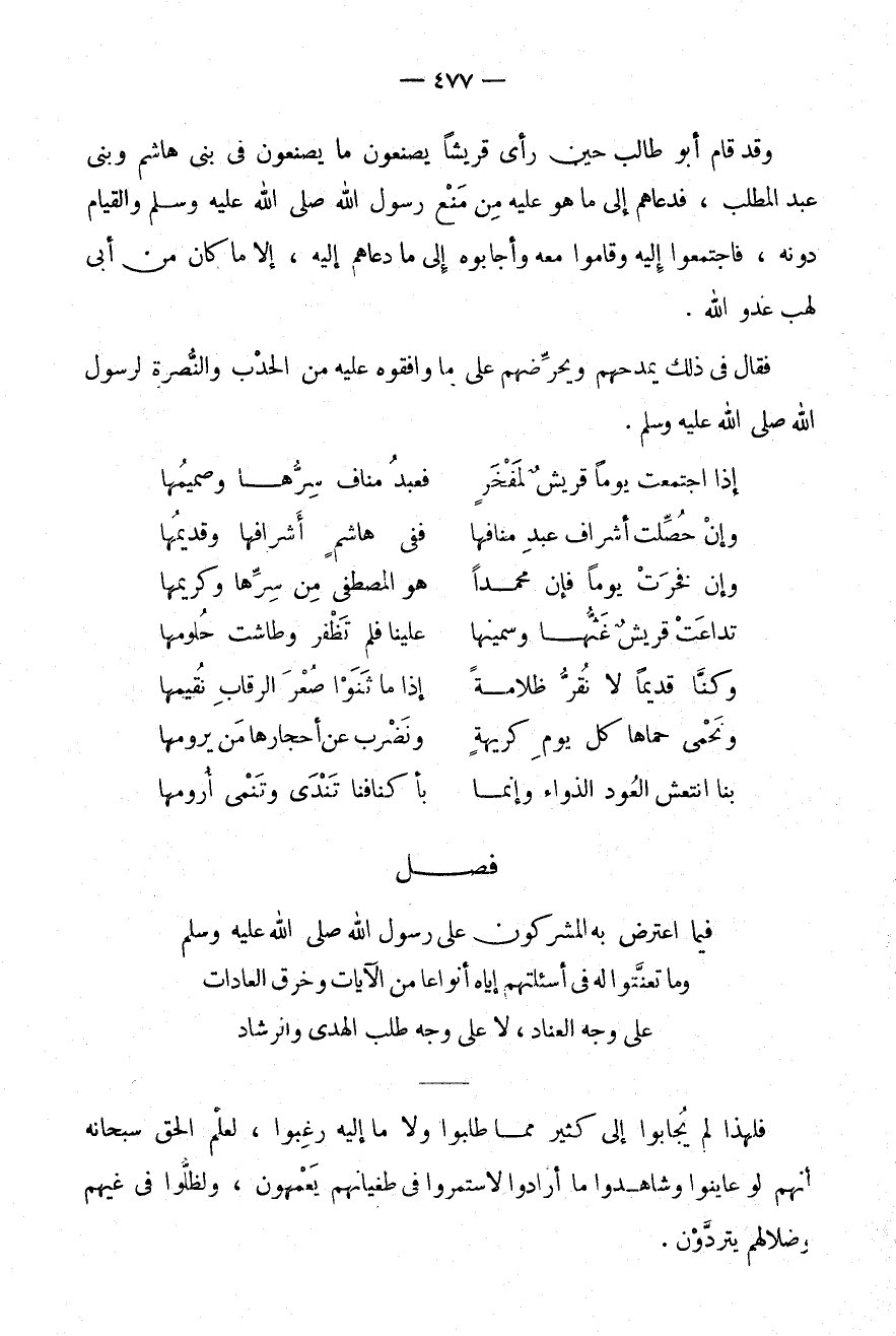 إِذَا اجْتَمَعَتْ يَوْمًا قُرَيْشٌ لِمَفْخَرٍ * فَعَبْدُ مَنَافٍ سِرُّهَا وَصَمِيمُهَا وَإِنْ حُصِّلَتْ أَشْرَافُ عَبْدِ مَنَافِهَا * فَفِي هَاشِمٍ أَشْرَافُهَا وَقَدِيمُهَا وَإِنْ فَخَرَتْ يَوْمًا فَإِنَّ مُحَمَّدًا * هُوَ الْمُصْطَفَى مِنْ سِرِّهَا وَكَرِيمُهَا تَدَاعَتْ قُرَيْشٌ غَثُّهَا وَسَمِينُهَا * عَلَيْنَا فَلَمْ تَظْفَرْ وَطَاشَتْ حُلُومُهَا وَكُنَّا قَدِيمًا لَا نقر ظلامة * إِذا مَا ثنوا صعر الرِّقَابِ نُقِيمُهَا وَنَحْمِي حِمَاهَا كُلَّ يَوْمِ كَرِيهَةٍ * وَنَضْرِبُ عَنْ أَحْجَارِهَا مَنْ يَرُومُهَا بِنَا انْتَعَشَ الْعود الذواء وَإِنَّمَا * بأكنافنا تندى وتنمى أرومها فَصْلٌ فِيمَا اعْتَرَضَ بِهِ الْمُشْرِكُونَ عَلَى رَسُولِ اللَّهِ صَلَّى اللَّهُ عَلَيْهِ وَسَلَّمَ وَمَا تَعَنَّتُوا لَهُ فِي أَسْئِلَتِهِمْ إِيَّاهُ أَنْوَاعًا مِنَ الْآيَاتِ وَخَرْقِ الْعَادَاتِ عَلَى وَجْهِ الْعِنَادِ، لَا عَلَى وَجْهِ طَلَبِ الْهُدَى وَالرَّشَادِ فَلِهَذَا لَمْ يُجَابُوا إِلَى كَثِيرٍ مِمَّا طَلَبُوا وَلَا مَا إِلَيْهِ رَغِبُوا، لِعِلْمِ الْحَقِّ سُبْحَانَهُ أَنَّهُمْ لَوْ عَايَنُوا وَشَاهَدُوا مَا أَرَادُوا لَاسْتَمَرُّوا فِي طُغْيَانِهِمْ يَعْمَهُونَ، وَلَظَلُّوا فِي غيهم وضلالهم يتردون.