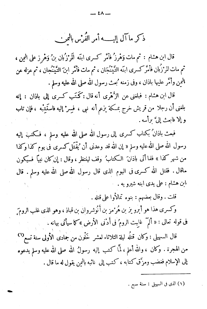 قَالَ ابْنُ هِشَامٍ: فَبَلَغَنِي عَنِ الزُّهْرِيِّ أَنَّهُ قَالَ: كَتَبَ كِسْرَى إِلَى بَاذَانَ: إِنَّهُ بَلَغَنِي أَنَّ رَجُلًا مِنْ قُرَيْشٍ خَرَجَ بِمَكَّةَ يَزْعُمُ أَنَّهُ نَبِيٌّ، فَسِرْ إِلَيْهِ فَاسْتَتِبْهُ، فَإِنْ تَابَ وَإِلَّا فَابْعَثْ إِلَيَّ بِرَأْسِهِ.