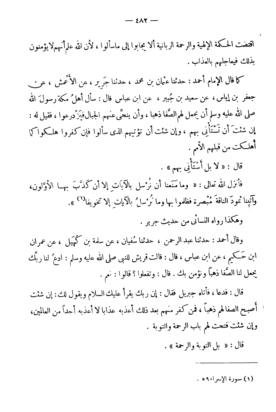 كَمَا قَالَ الْإِمَامُ أَحْمَدُ: حَدَّثَنَا عُثْمَانُ بْنُ مُحَمَّدٍ، حَدَّثَنَا جَرِيرٌ، عَنِ الْأَعْمَشِ، عَنْ جَعْفَرِ بْنِ إِيَاسٍ، عَنْ سَعِيدِ بْنِ جُبَيْرٍ، عَنِ ابْنِ عَبَّاسٍ قَالَ: سَأَلَ أَهْلُ مَكَّةَ رَسُولَ اللَّهِ صَلَّى اللَّهُ عَلَيْهِ وَسَلَّمَ أَنْ يَجْعَلَ لَهُمُ الصَّفَا ذَهَبًا، وَأَنْ يُنَحِّيَ عَنْهُمُ الْجِبَالُ فَيَزْدَرِعُوا، فَقِيلَ لَهُ: إِنْ شِئْتَ أَنْ تَسْتَأْنِيَ بِهِمْ، وَإِنْ شِئْتَ أَن تؤتيهم الذى سَأَلُوا فَإِن كفرُوا هَلَكُوا كَمَا أهلكت من قبلهم الامم.