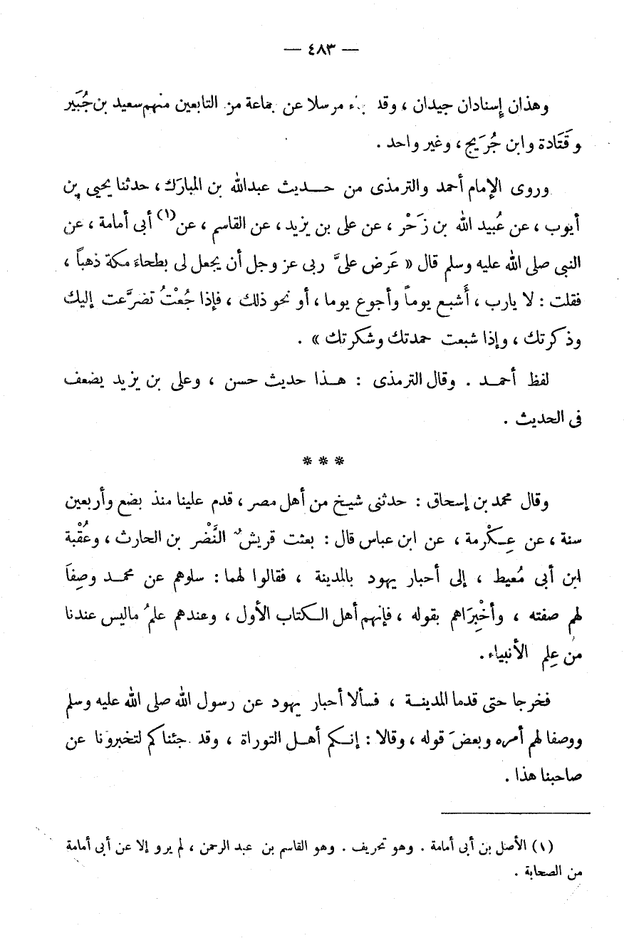 وَرَوَى الْإِمَامُ أَحْمَدُ وَالتِّرْمِذِيُّ مِنْ حَدِيثِ عَبْدِ اللَّهِ بْنِ الْمُبَارَكِ، حَدَّثَنَا يَحْيَى بْنُ أَيُّوبَ، عَنْ عُبَيْدِ اللَّهِ بْنِ زَحْرٍ، عَنْ عَلِيِّ بْنِ يَزِيدَ، عَنِ الْقَاسِمِ، عَنْ (1) أَبِي أُمَامَةَ، عَنِ النَّبِيِّ صَلَّى اللَّهُ عَلَيْهِ وَسَلَّمَ قَالَ " عَرَضَ على ربى عزوجل أَنْ يَجْعَلَ لِي بَطْحَاءَ مَكَّةَ ذَهَبًا، فَقُلْتُ: لَا يَا رَبُّ، أَشْبَعُ يَوْمًا وَأَجُوعُ يَوْمًا، أَوْ نَحْوَ ذَلِكَ، فَإِذَا جُعْتُ تَضَرَّعْتُ إِلَيْكَ وَذَكَرْتُكَ، وَإِذَا شَبِعْتُ حَمِدْتُكَ وَشَكَرْتُكَ ".