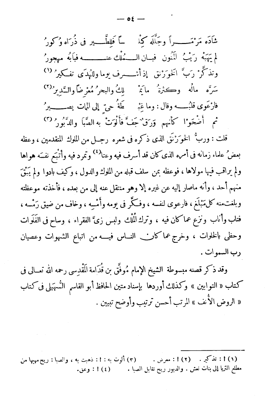 قُلْتُ: وَرَبُّ الْخَوَرْنَقِ الَّذِي ذَكَرَهُ فِي شِعْرِهِ رَجُلٌ مِنَ الْمُلُوكِ الْمُتَقَدِّمِينَ، وَعَظَهُ بَعْضُ عُلَمَاءِ زَمَانِهِ فِي أَمْرِهِ الَّذِي كَانَ قَدْ أَسْرَفَ فِيهِ وَعَتَا (4) وَتَمَرَّدَ فِيهِ وَأَتْبَعَ نَفْسَهُ هَوَاهَا وَلَمْ يُرَاقِبْ فِيهَا مَوْلَاهَا، فَوَعَظَهُ بِمَنْ سَلَفَ قَبْلَهُ مِنَ الْمُلُوكِ وَالدُّوَلِ، وَكَيْفَ بَادُوا وَلَمْ يَبْقَ مِنْهُمْ أَحَدٌ، وَأَنَّهُ مَا صَارَ إِلَيْهِ عَنْ غَيْرِهِ إِلَّا وَهُوَ مُنْتَقِلٌ عَنْهُ إِلَى مَنْ بَعْدَهُ، فَأَخَذَتْهُ مَوْعِظَتُهُ وَبَلَغَتْ مِنْهُ كُلَّ مَبْلَغٍ، فَارْعَوَى لِنَفْسِهِ، وَفَكَّرَ فِي يَوْمِهِ وَأَمْسِهِ، وَخَافَ مِنْ ضِيقِ رَمْسِهِ، فَتَابَ وَأَنَابَ وَنَزَعَ عَمَّا كَانَ فِيهِ، وَتَرَكَ الْمُلْكَ وَلَبِسَ زِيَّ الْفُقَرَاءِ، وساح فِي الفلوات وحظي بالخطوات، وَخَرَجَ عَمَّا كَانَ النَّاسُ فِيهِ مِنِ اتِّبَاعِ الشَّهَوَات وعصيان رب السَّمَوَات.