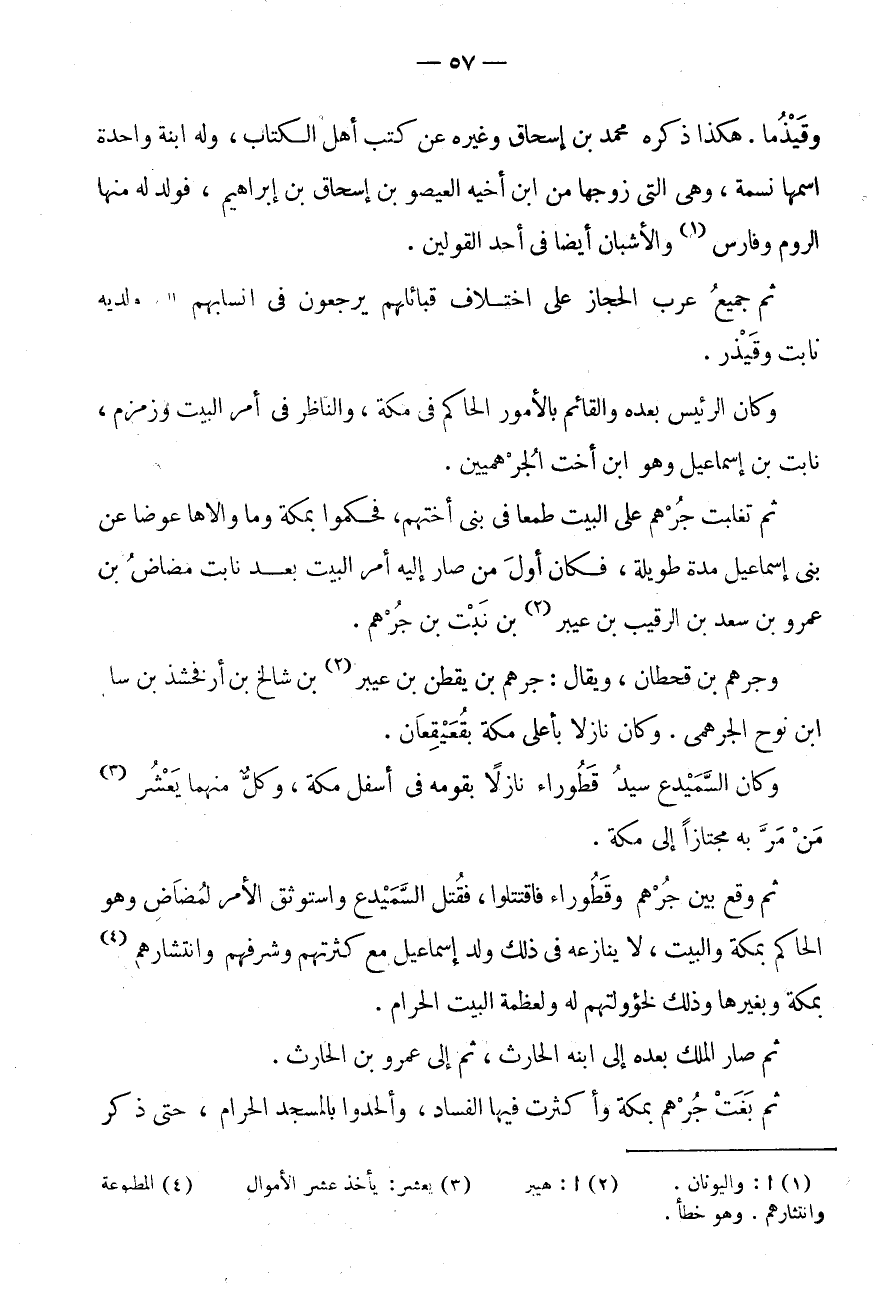 ثُمَّ تَغَلَّبَتْ جُرْهُمٌ عَلَى الْبَيْتِ طَمَعًا فِي بَنِي أُخْتِهِمْ، فَحَكَمُوا بِمَكَّةَ وَمَا وَالَاهَا عِوَضًا عَنْ بَنِي إِسْمَاعِيلَ مُدَّةً طَوِيلَةً، فَكَانَ أَوَّلُ مَنْ صَارَ إِلَيْهِ أَمر الْبَيْت بعد نابت مضاض بْنَ عَمْرِو بْنِ سَعْدِ بْنِ الرَّقِيبِ بْنِ عيبر (2) بْنِ نَبْتِ بْنِ جُرْهُمٍ.