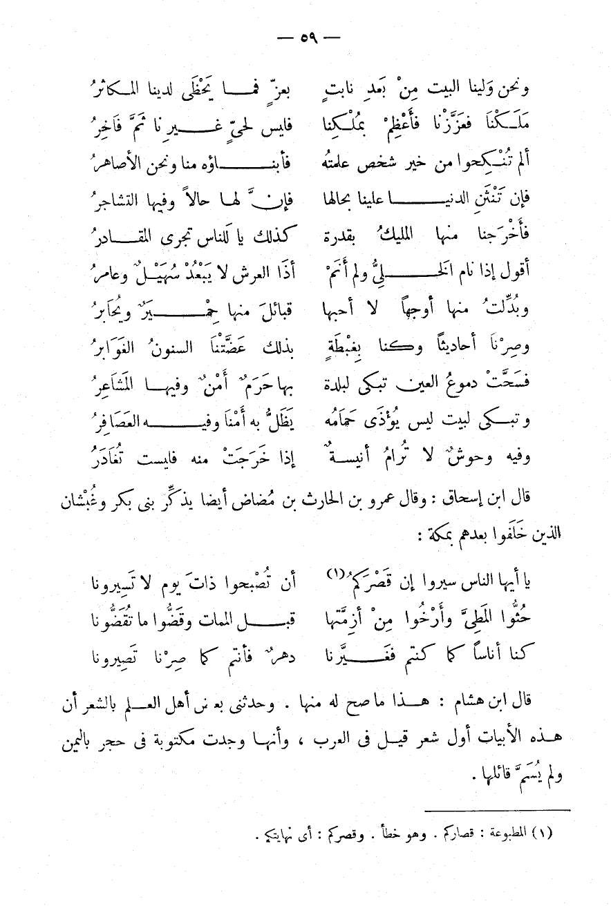 وَنَحْنُ وَلِينَا الْبَيْتَ مِنْ بَعْدِ نَابِتٍ * بِعِزٍّ فَمَا يَحْظَى لَدَيْنَا الْمُكَاثِرُ مَلَكْنَا فَعَزَّزْنَا فَأَعْظِمْ بِمُلْكِنَا * فَلَيْسَ لِحَيٍّ غَيْرِنَا ثَمَّ فَاخِرُ أَلَمْ تُنْكِحُوا مِنْ خَيْرِ شَخْصٍ عَلِمْتُهُ * فَأَبْنَاؤُهُ مِنَّا وَنَحْنُ الْأَصَاهِرُ فَإِنْ تَنْثَنِ الدُّنْيَا عَلَيْنَا بِحَالِهَا * فَإِنَّ لَهَا حَالًا وَفِيهَا التَّشَاجُرُ فَأَخْرَجَنَا مِنْهَا الْمَلِيكُ بِقُدْرَةٍ * كَذَلِكَ يَا لَلنَّاسِ تَجْرِي الْمَقَادِرُ أَقُولُ إِذَا نَامَ الْخَلِيُّ وَلَمْ أَنَمْ * أَذَا الْعَرْشِ لَا يَبْعُدْ سُهَيْلٌ وَعَامِرُ وَبُدِّلْتُ مِنْهَا أَوْجُهًا لَا أُحِبُّهَا * قَبَائِلُ مِنْهَا حِمْيَرٌ وَيَحَابِرُ وَصِرْنَا أَحَادِيثًا وَكُنَّا بِغِبْطَةٍ * بِذَلِكَ عَضَّتْنَا السُّنُونُ الْغَوَابِرُ فَسَحَّتْ دُمُوعُ الْعَيْنِ تَبْكِي لِبَلْدَةٍ * بِهَا حَرَمٌ أَمْنٌ وَفِيهَا الْمَشَاعِرُ وَتَبْكِي لِبَيْتٍ لَيْسَ يُؤْذَى حَمَامُهُ * يَظَلُّ بِهِ أَمْنًا وَفِيهِ الْعَصَافِرُ وَفِيهِ وُحُوشٌ لَا تُرَامُ أَنِيسَةٌ * إِذَا خَرَجَتْ مِنْهُ فَلَيْسَتْ تُغَادِرُ قَالَ ابْنُ إِسْحَاقَ: وَقَالَ عَمْرُو بْنُ الْحَارِثِ بْنِ مُضَاضٍ أَيْضًا يَذْكُرُ بَنِي بَكْرٍ وَغُبْشَانَ الَّذِينَ خَلَفُوا بَعْدَهُمْ بِمَكَّةَ: يَا أَيُّهَا النَّاسُ سِيرُوا إِنَّ قَصْرَكُمْ (1) أَنْ تُصْبِحُوا ذَاتَ يَوْمٍ لَا تَسِيرُونَا حُثُّوا الْمَطِيَّ وَأَرْخُوا مِنْ أَزِمَّتِهَا * قَبْلَ الْمَمَاتِ وَقَضُّوا مَا تُقَضُّونَا كُنَّا أُنَاسًا كَمَا كُنْتُمْ فَغَيَّرَنَا * دَهْرٌ فَأَنْتُمْ كَمَا صِرْنَا تَصِيرُونَا قَالَ ابْنُ هِشَامٍ: هَذَا مَا صَحَّ لَهُ مِنْهَا.