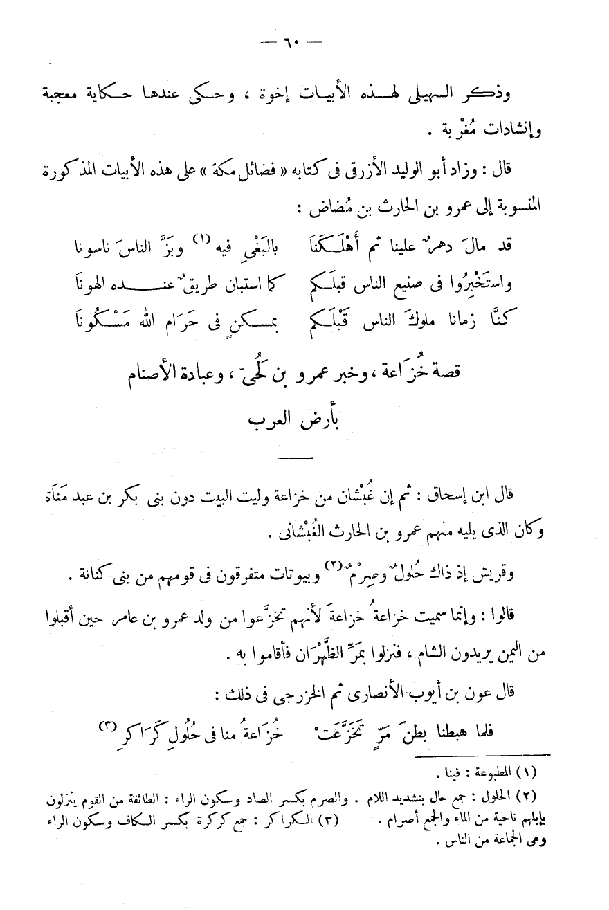 قَالَ: وَزَادَ أَبُو الْوَلِيدِ الْأَزْرَقِيُّ فِي كِتَابِهِ " فَضَائِلِ مَكَّةَ " عَلَى هَذِهِ الْأَبْيَاتِ الْمَذْكُورَةِ الْمَنْسُوبَةِ إِلَى عَمْرِو بْنِ الْحَارِثِ بْنِ مُضَاضٍ: قَدْ مَال دهر علينا ثمَّ أهلكنا * بالبغى فِيهِ (1) وبز النَّاس ناسونا وَاسْتَخْبِرُوا فِي صَنِيعِ النَّاسِ قَبْلَكُمُ * كَمَا اسْتَبَانَ طَرِيقٌ عِنْدَهُ الْهُونَا كُنَّا زَمَانًا مُلُوكَ النَّاسِ قَبْلَكُمُ * بِمَسْكَنٍ فِي حَرَامِ اللَّهِ مَسْكُونَا قِصَّةُ خُزَاعَة، وَخبر عَمْرو بن لحى، وَعبادَة الاصنام بِأَرْض الْعَرَب قَالَ ابْنُ إِسْحَاقَ: ثُمَّ إِنَّ غُبْشَانَ مِنْ خُزَاعَةَ وَلِيَتِ الْبَيْتَ دُونَ بَنِي بَكْرِ بْنِ عَبْدِ مَنَاةَ وَكَانَ الَّذِي يَلِيهِ مِنْهُمْ عَمْرُو بْنُ الْحَارِثِ الْغُبْشَانِيُّ.