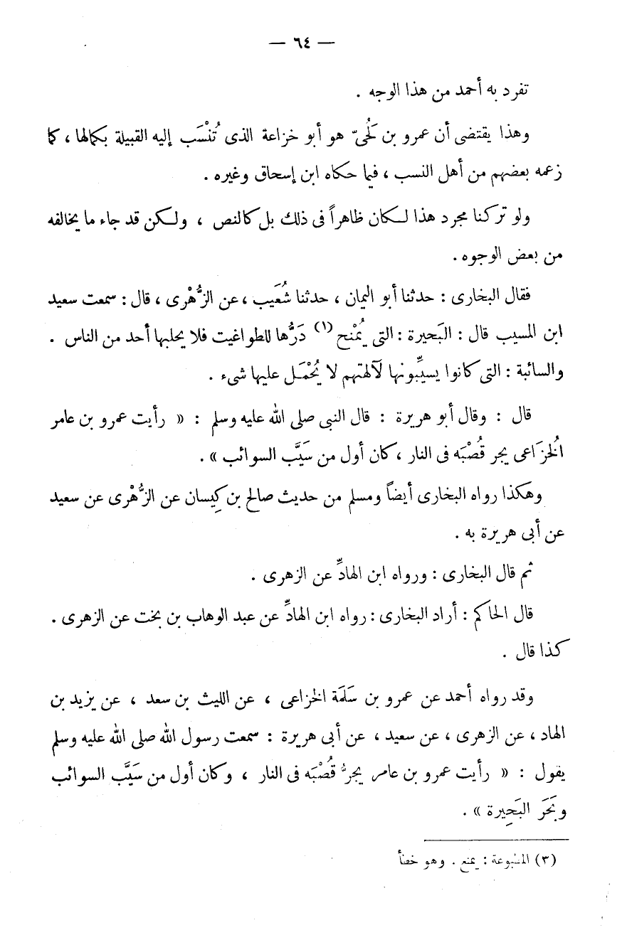 قَالَ: وَقَالَ أَبُو هُرَيْرَةَ: قَالَ النَّبِيُّ صَلَّى اللَّهُ عَلَيْهِ وَسَلَّمَ: " رَأَيْتُ عَمْرَو بْنَ عَامِرٍ الْخُزَاعِيَّ يَجُرُّ قُصْبَهُ فِي النَّارِ، كَانَ أَوَّلَ مَنْ سَيَّبَ السَّوَائِبَ ".