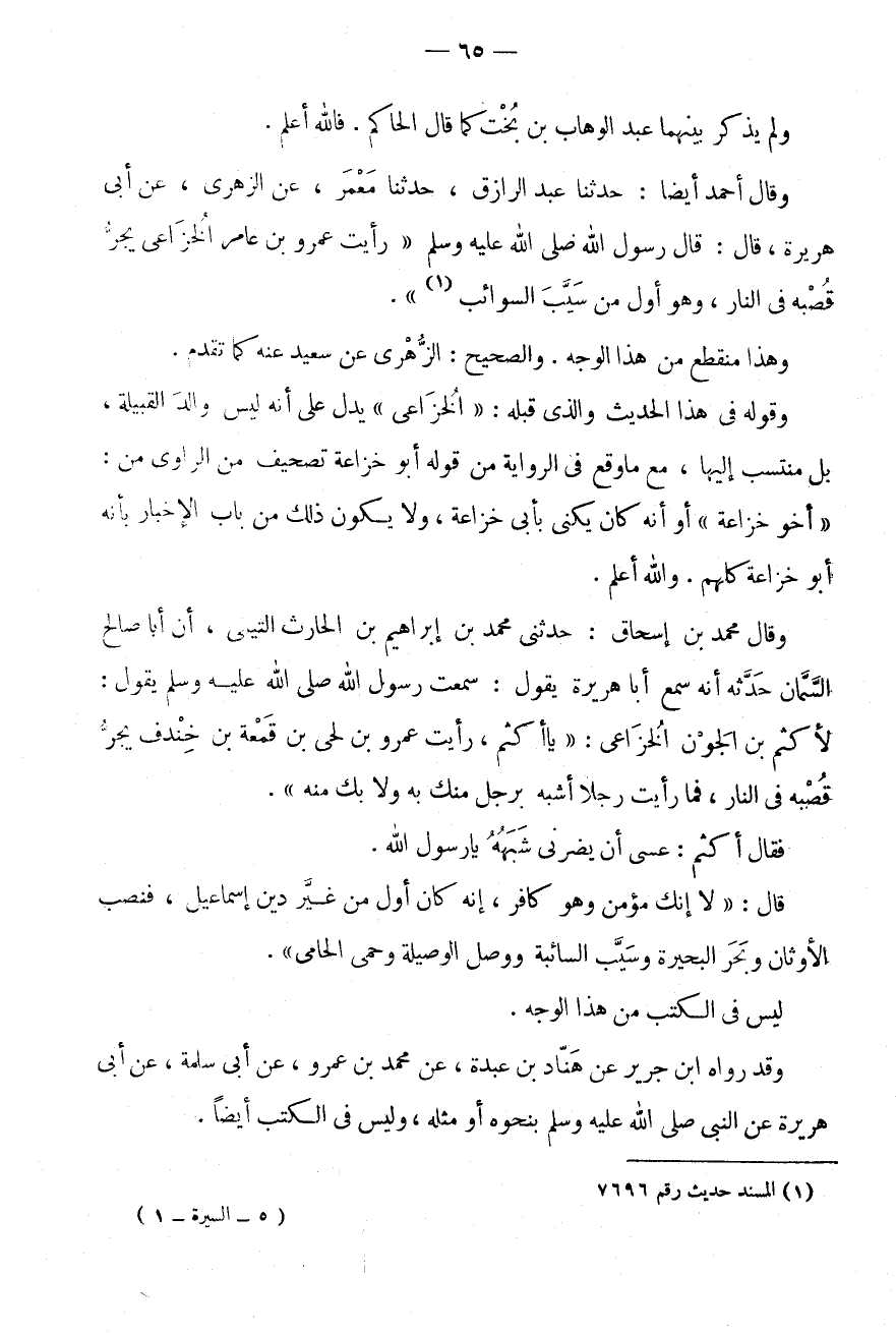 قُصْبَهُ فِي النَّارِ، وَهُوَ أَوَّلُ مَنْ سَيَّبَ السَّوَائِبَ (1) ".