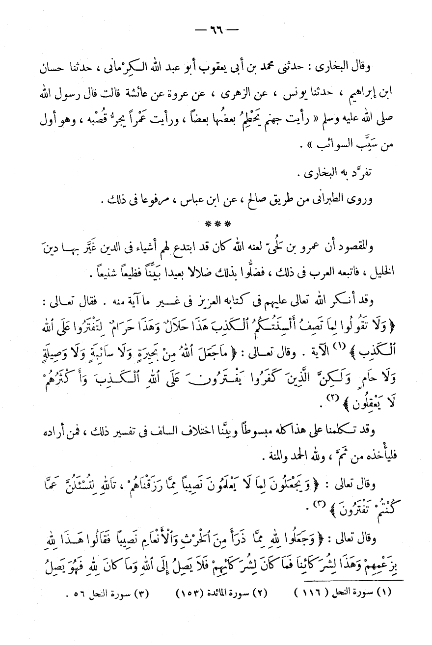 وَقَالَ الْبُخَارِيُّ: حَدَّثَنِي مُحَمَّدُ بْنُ أَبِي يَعْقُوبَ أَبُو عبد الله الْكرْمَانِي، حَدثنَا حسان ابْن ابْرَاهِيمَ، حَدَّثَنَا يُونُسُ، عَنِ الزُّهْرِيِّ، عَنْ عُرْوَةَ عَنْ عَائِشَةَ قَالَتْ قَالَ رَسُولُ اللَّهِ صَلَّى اللَّهُ عَلَيْهِ وَسَلَّمَ " رَأَيْتُ جَهَنَّمَ يَحْطِمُ بَعْضُهَا بَعْضًا، وَرَأَيْتُ عَمْرًا يَجُرُّ قُصْبَهُ، وَهُوَ أَوَّلُ مَنْ سَيَّبَ السَّوَائِبَ ".