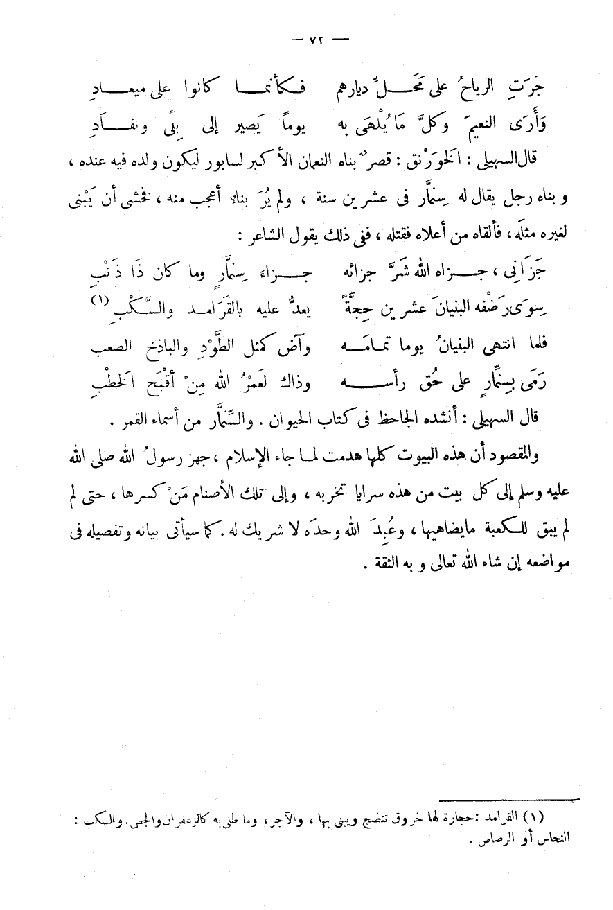 جَرَتِ الرِّيَاحُ عَلَى مَحَلِّ دِيَارِهِمْ * فَكَأَنَّمَا كَانُوا على ميعاد وَأرى النَّعيم وكل مَا يُلْهَى بِهِ * يَوْمًا يَصِيرُ إِلَى بِلًى وَنَفَادِ قَالَ السُّهيْلي: الْخَوَرْنَقُ: قَصْرٌ بَنَاهُ النُّعْمَانُ الْأَكْبَرُ لِسَابُورَ لِيَكُونَ وَلَدُهُ فِيهِ عِنْدَهُ، وَبَنَاهُ رَجُلٌ يُقَالَ لَهُ سنمار فِي عشْرين سنة، وَلم ير بِنَاء أعجب مِنْهُ، فخشى أَنْ يَبْنِيَ لِغَيْرِهِ مِثْلَهُ، فَأَلْقَاهُ مِنْ أَعْلَاهُ فَقَتَلَهُ، فَفِي ذَلِكَ يَقُولُ الشَّاعِرُ: جَزَانِي، جَزَاهُ اللَّهُ شَرَّ جَزَائِهِ * جَزَاءَ سِنِمَّارَ وَمَا كَانَ ذَا ذَنْب سوى رضفه الْبُنْيَانَ عِشْرِينَ حَجَّةً * يَعُدُّ عَلَيْهِ بِالْقَرَامِدِ وَالسَّكْبِ (1) فَلَمَّا انْتَهَى الْبُنْيَانُ يَوْمًا تَمَامَهُ * وَآضَ كَمِثْلِ الطَّوْدِ وَالْبَاذِخِ الصَّعْبِ رَمَى بِسِنِمَّارَ عَلَى حُقِّ رَأْسِهِ * وَذَاكَ لَعَمْرُ اللَّهِ مِنْ أَقْبَحِ الْخَطْبِ قَالَ السُّهَيْلِيُّ: أَنْشَدَهُ الْجَاحِظُ فِي كِتَابِ الْحَيَوَانِ.