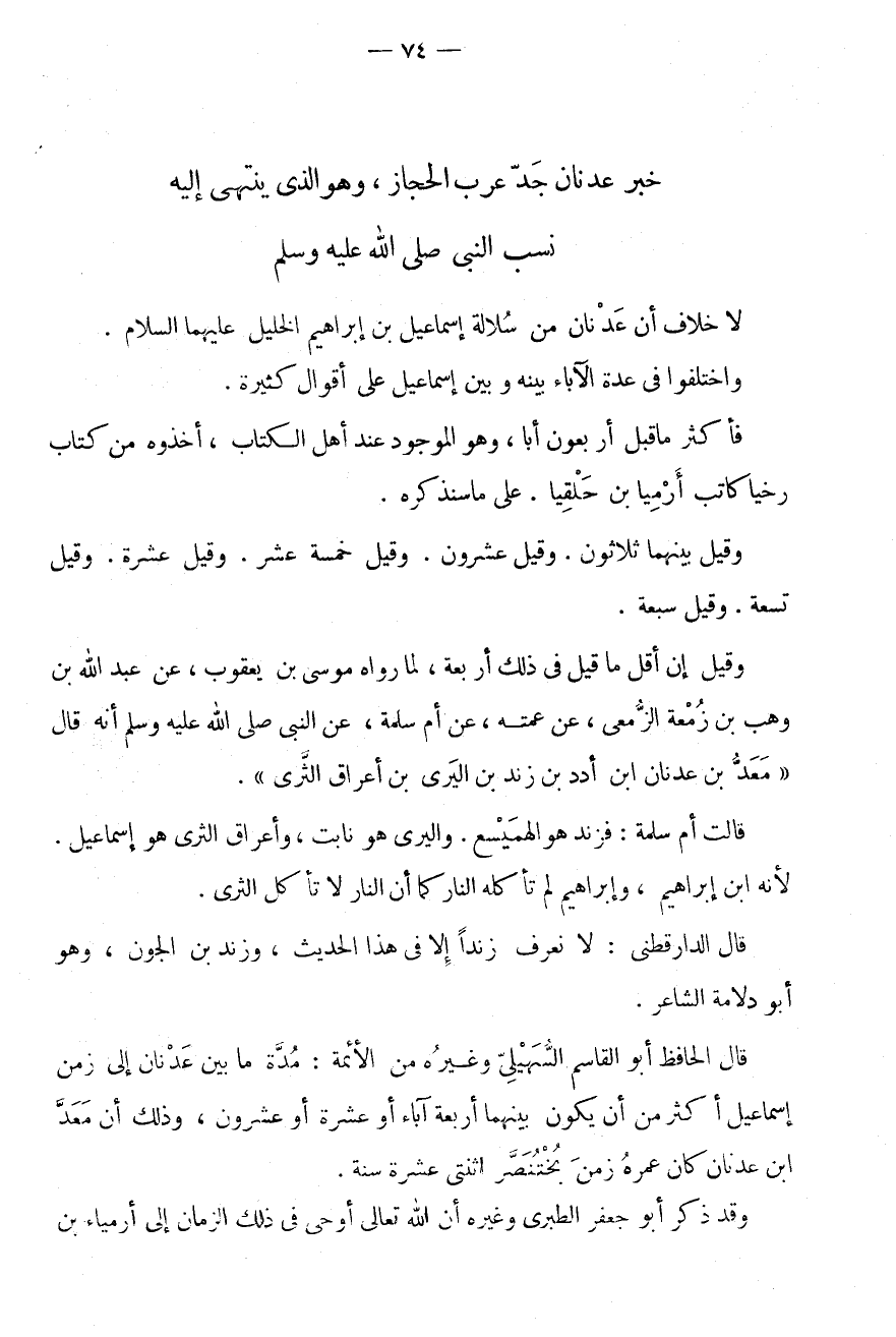 خبر عدنان جد عرب الْحجاز، وَهُوَ الذى ينتهى إِلَيْهِ نسب النَّبِي صلى الله عَلَيْهِ وَسلم لَا خِلَافَ أَنَّ عَدْنَانَ مِنْ سُلَالَةِ إِسْمَاعِيلَ بْنِ ابْرَاهِيمَ الْخَلِيلِ عَلَيْهِمَا السَّلَامُ.