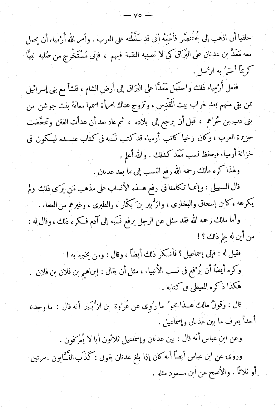 قَالَ: وَقَول مَالك هَذَا نَحْو مَا رُوِيَ عَنْ عُرْوَةَ بْنِ الزُّبَيْرِ أَنَّهُ قَالَ: مَا وَجَدْنَا أَحَدًا يَعْرِفُ مَا بَيْنَ عَدْنَانَ وَإِسْمَاعِيلَ.